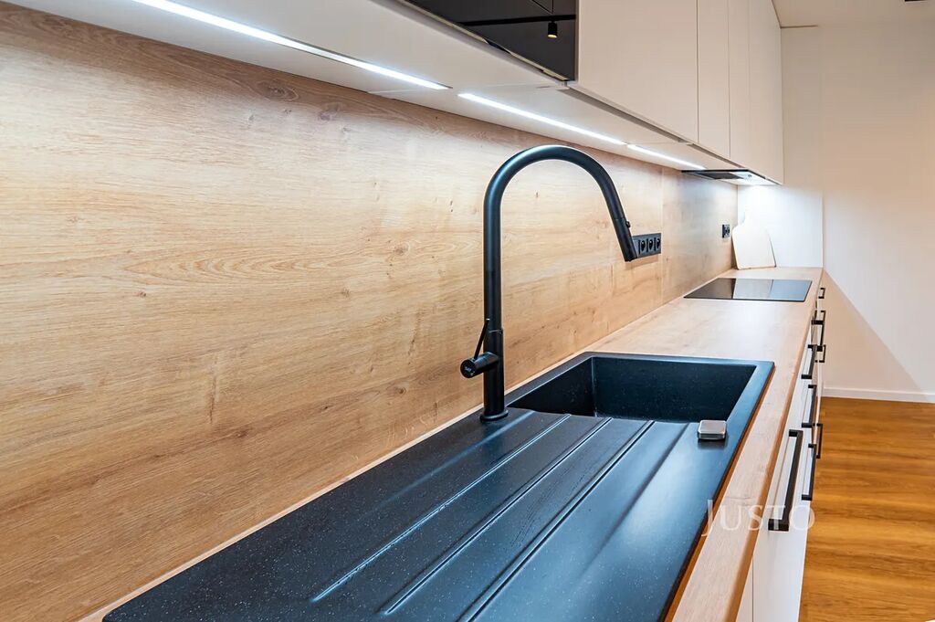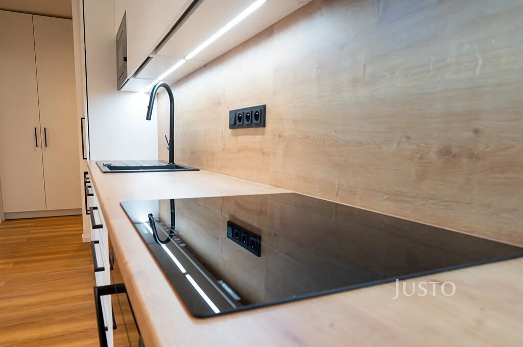 ● kuchyňský kout s moderní kuchyňskou linkou plně vybavenou vestavěnými spotřebiči (lednice NO FROST, mrazák, myčka, el. trouba, sklokeramická varná deska, mikrovlnná trouba),