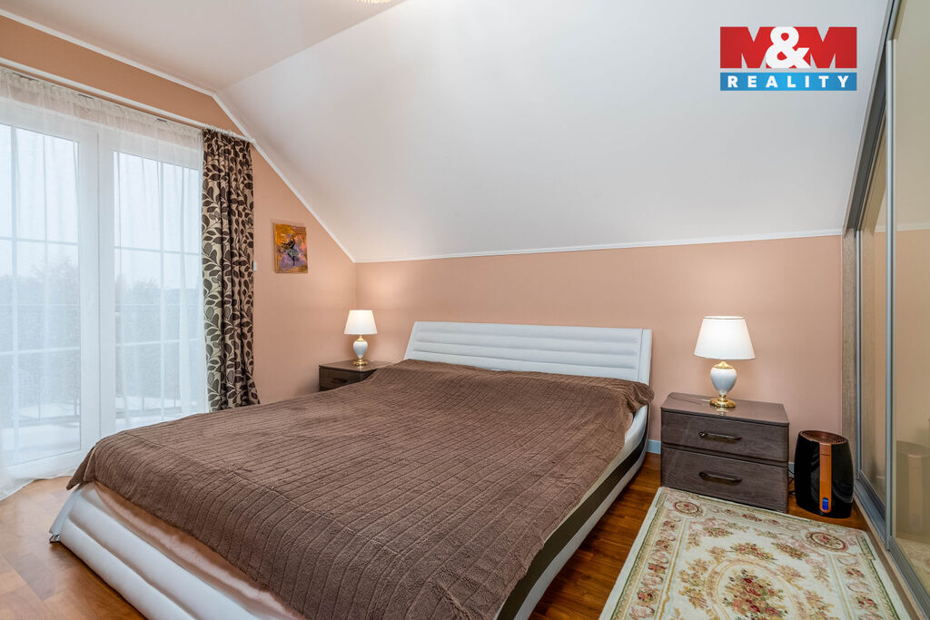 V patře se nachází dva dětské pokoje, pracovna, prostorná ložnice a koupelna. Z ložnice i koupelny je vstup na balkon s výhledem do zeleně.