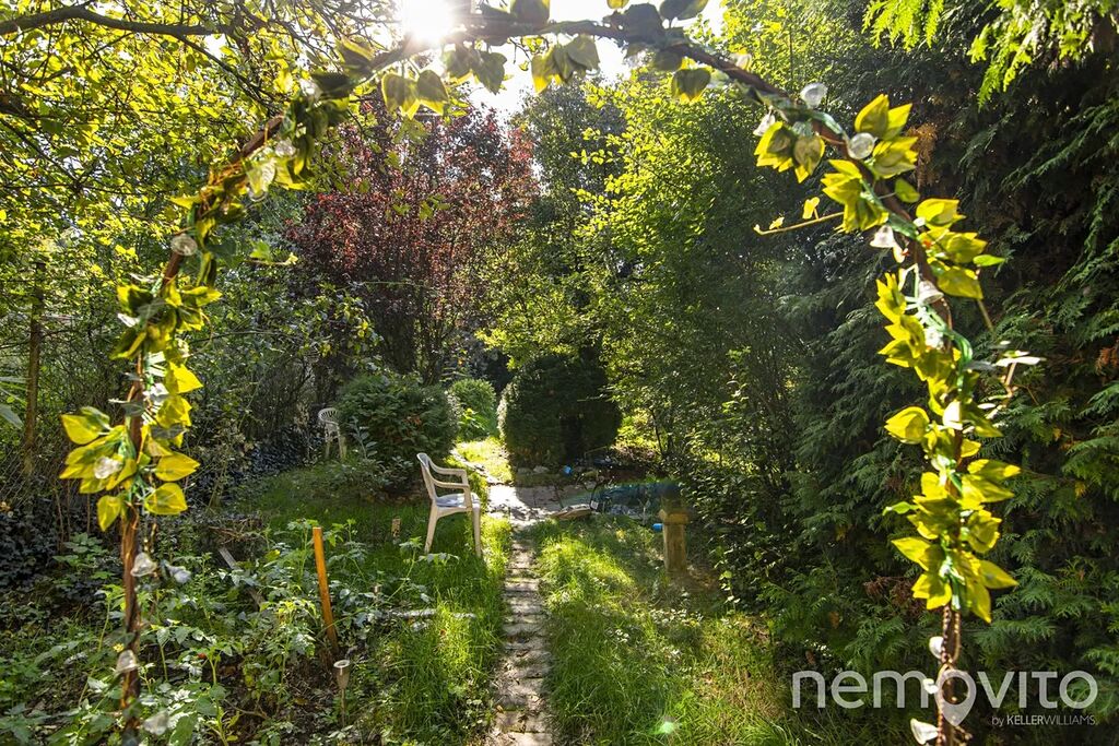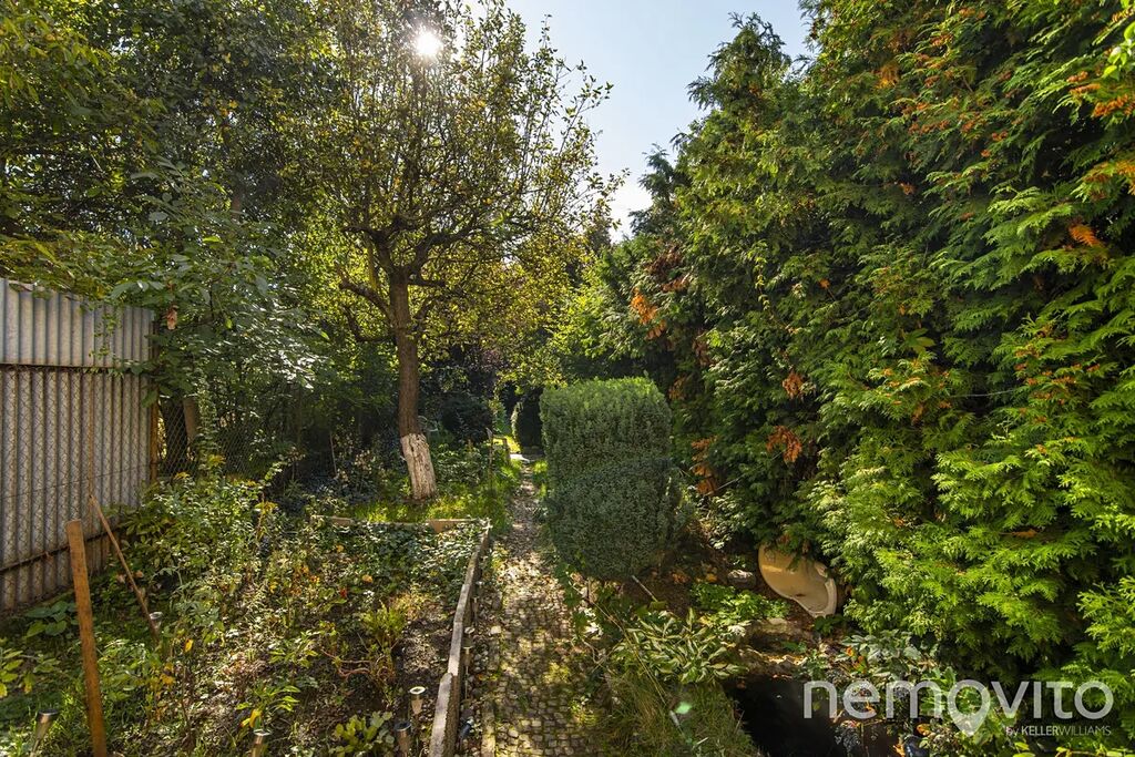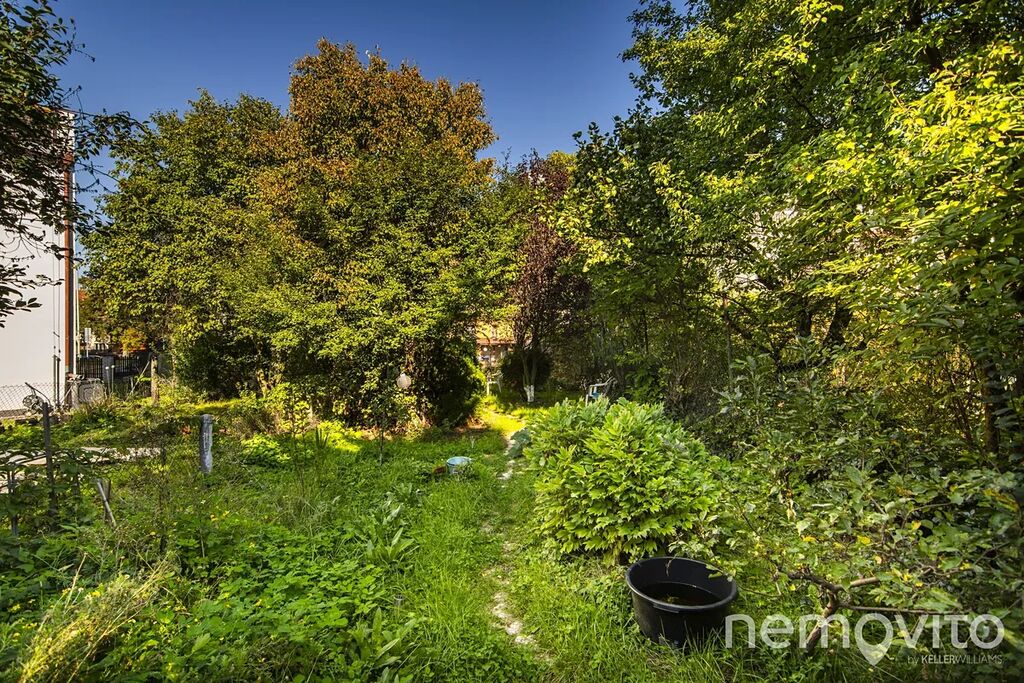 Zahrada je orientovaná na jihovýchod a nabízí příjemné soukromí i místo pro relax díky spoustě zeleně. Najdete na ní pár starších záhonů a dřevěný domek na úschovu zahradního vybavení.