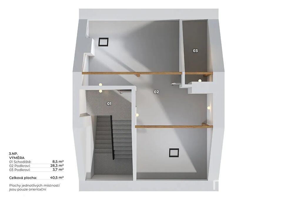 Dům aktuálně sestává ze sklepa se čtyřmi oddělenými místnostmi, z nichž jedna slouží jako prádelna. V prvním nadzemním podlaží je vstupní chodba, předsíň, koupelna, kuchyně a ložnice. Ve druhém nadzemním podlaží najdete další předsíň, sklad, průchozí pokoj a ložnici. V podkroví je oddělený sklad.
