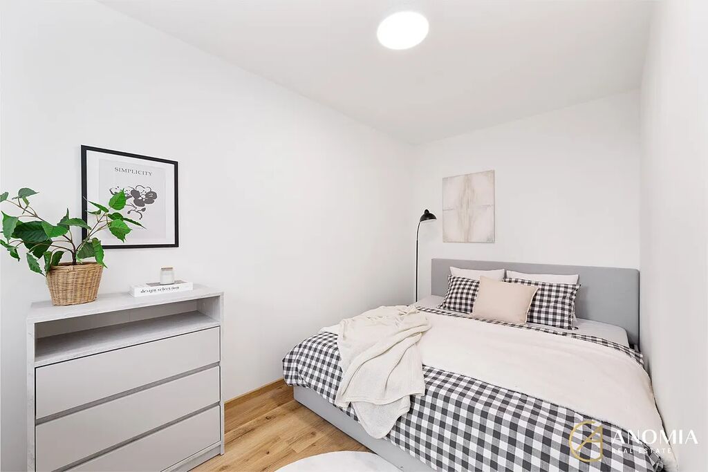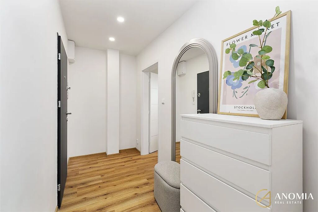 V bytě dále najdete útulnou ložnici, prostornou vstupní chodbu a moderní koupelnu se sprchovým koutem, WC, led zrcadlem, umyvadlovou skříňkou a velkoformátovými obklady, které podtrhují elegantní, nadčasový charakter interiéru. Ve sprchovém koutě je praktická podsvětlená nika.