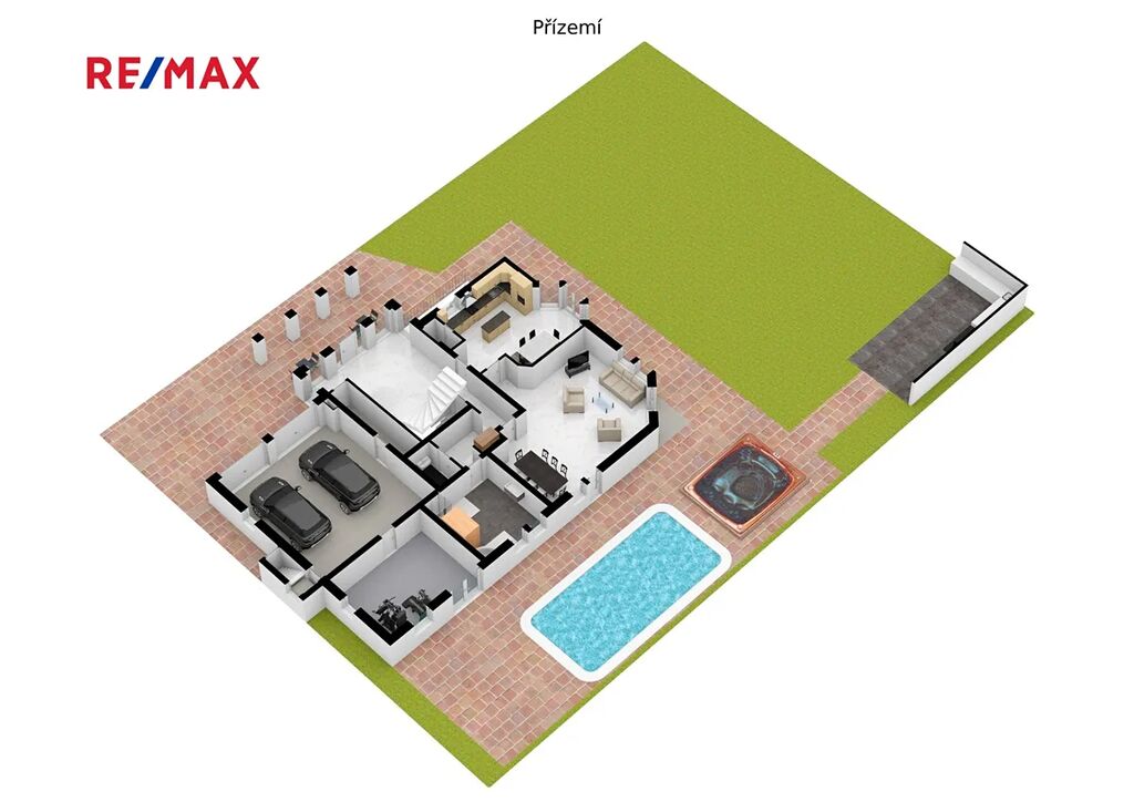 V 1. NP se nachází: Kuchyně (cca 28,23m²), obývací prostor (cca 52,41m²), hala (cca 25,90m²), chodba (cca 13,82m²), komora (1,70m²), koupelna s Infrasaunou (cca 17,76m²), toaleta (cca 2,82m²), technická místnost (cca 24,65m²), terasa (cca 14m²), garáž (cca 51,37m²), fitnes ( cca 25m²).