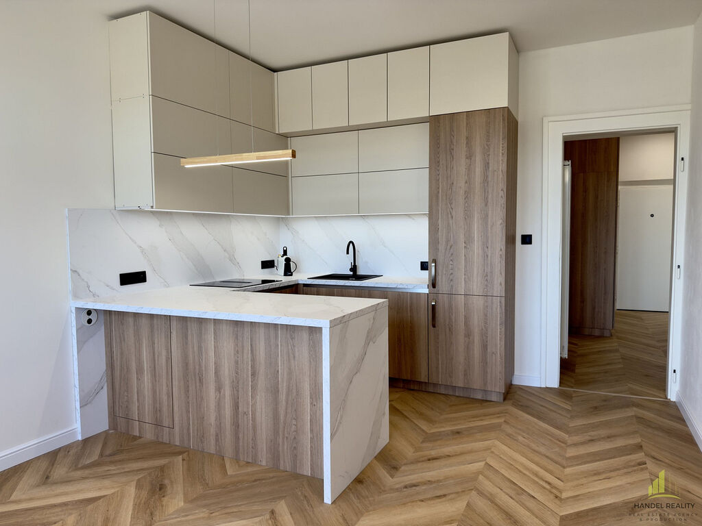 Srdcem bytu je kuchyňský kout s barem, který je vybaven zcela novými spotřebiči, indukční varnou deskou se zabudovaným odsáváním, troubou a myčkou značky Bosch. Dále je v kuchyni vestavěná velká lednice s mrazákem AEG. Díky systému skříní a polic vyrobených na míru nabízí dostatek úložného prostoru a působí čistým, elegantním dojmem. Každý, kdo rád vaří, určitě ocení podsvícenou pracovní desku s LED páskem, která zpříjemní vaření a dodá kuchyni příjemnou atmosféru.
