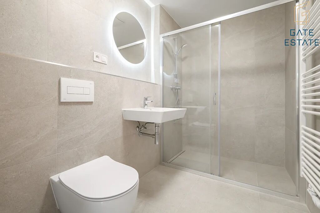Kuchyňská linka je vybavena varnou deskou, troubou, digestoří a lednicí s mrazákem. K dispozici je také pračka. Koupelna se sprchovým koutem, toaletou a umyvadlem. Vše je nové a připravené k nastěhování.