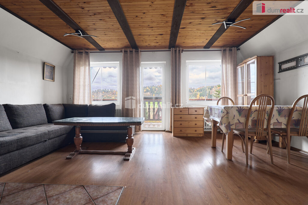 V přízemí chaty se nachází zádveří, vstupní chodba, obývací pokoj s krbovými kamny a vstupem na balkon, kuchyně s kuchyňskou linkou na míru, koupelna se sprchovým koutem a WC, a samozřejmě schodiště. V podkroví se pak nacházejí dva samostatné pokoje a prostorná půda pro uskladnění věcí. Ve sklepě najdete společenskou místnost, dílničku a technickou místnost. Vytápění domu je zajištěno tepelným čerpadlem (3roky) a ohřev vody je zajištěn el. bojlerem (3roky).