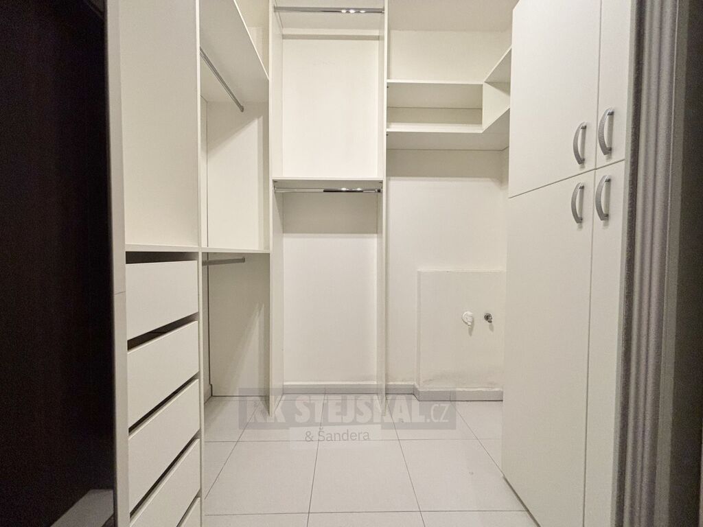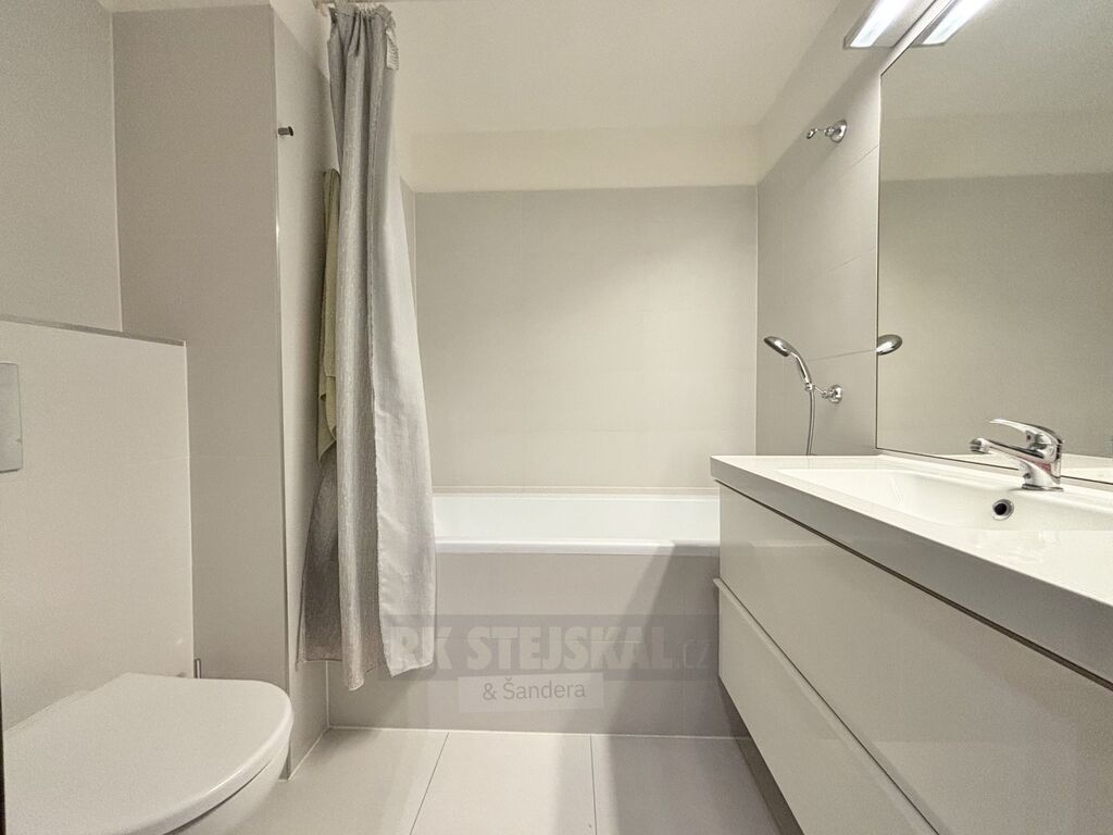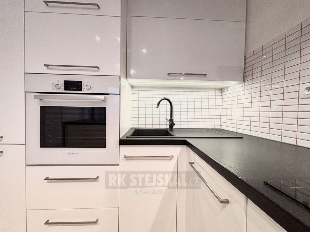 Byt je navržen s velkým citem pro detail a kvalitu – každý prvek byl pečlivě promyšlen a na použitých materiálech se rozhodně nešetřilo. Po vstupu vás přivítá prostorná hala s praktickým úložným prostorem na obuv a oděvy. Součástí je elegantní zrcadlová příčka, za kterou se ukrývá velká šatna s dostatkem místa na oblečení a také prostor pro pračku se sušičkou. Z haly se vstupuje do světlého obývacího pokoje propojeného s moderní kuchyní. Dominantou obytné části je zakázková kuchyňská linka ve tvaru U, vybavená vestavnými spotřebiči – indukční varnou deskou, troubou, myčkou a lednicí. V obývací zóně se nachází pohodlná sedací souprava a přímý vstup na lodžii, která nabízí příjemné posezení venku. Ložnice působí vzdušně a je zařízena stylovou postelí s nočními stolky. Koupelna je vybavena vanou, toaletou a umyvadlem s úložným prostorem. Celý byt je díky velkým oknům krásně prosvětlený, přičemž žaluzie a závěsy zaručují naprosté soukromí.