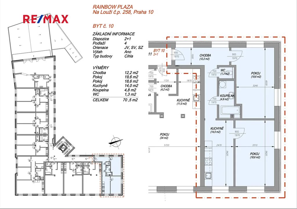 Nabízíme k pronájmu světlý byt 2+1 o velikosti 70,5 m², který se nachází ve 4. patře moderní cihlové novostavby s výtahovým přístupem v projektu Rainbow Plaza.