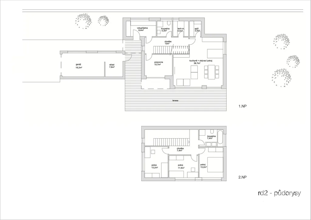 Komplex nabízí unikátní příležitost pro multigenerační bydlení v nejvyšší možné míře komfortu a soukromí. Větší vila nabízí vlastní příjezdovou cestu, dvě garážová stání a venkovní parkování. Dále terasu s bazénem a rozlehlou zahradu. Menší vila nabízí jedno garážové stání a další venkovní parkování. Půdorysy obou vil jsou pouze orientační, dispozice lze pozměnit.