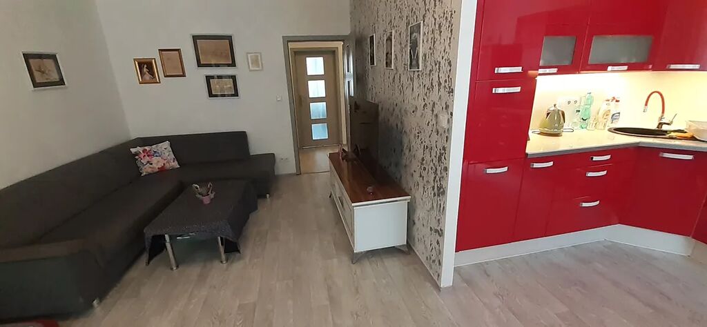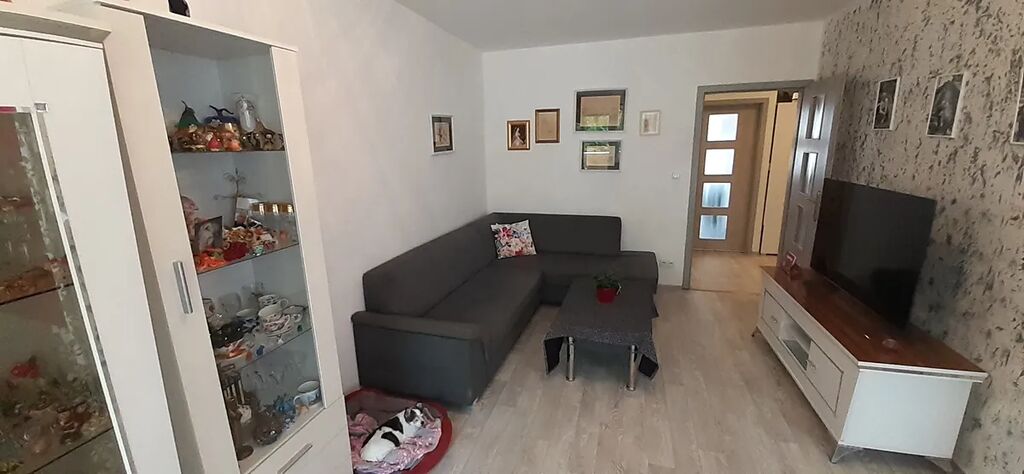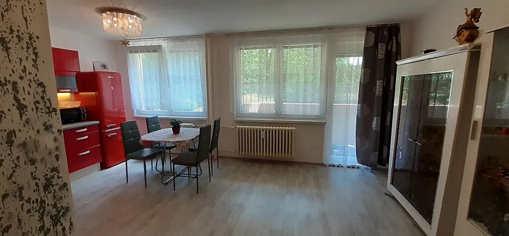 Obývací prostor s kuchyňskou a jídelní částí je vybaven moderní kuchyňskou linkou. Je velmi světlý s výhledem do přilehlého parku s krásnými vzrostlými stromy. Výhled do zeleně a vůně borovic Vám zpříjemní každé posezení na balkonu.