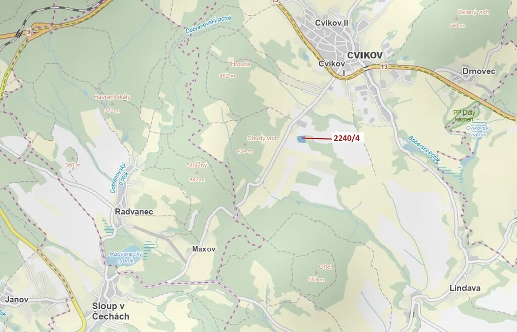 Lesní pozemek o výměře 8 809 m2, parcelní číslo 2240/4, podíl 1/1, katastrální území Cvikov, obec Cvikov, obec s rozšířenou působností Nový Bor, okres Česká Lípa, Liberecký kraj. Po těžbě.