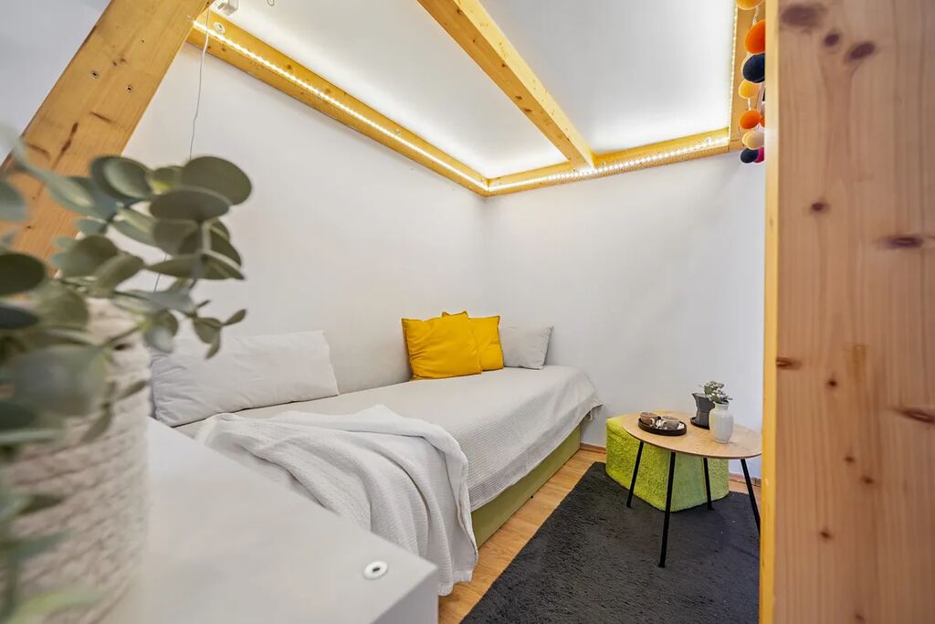 Díky vysokým stropům je prostor efektivně využit díky mezoninovému spaní. Na podlahách je dlažba a plovoucí podlaha. Vytápění i ohřev vody zajišťuje elektrický kotel.