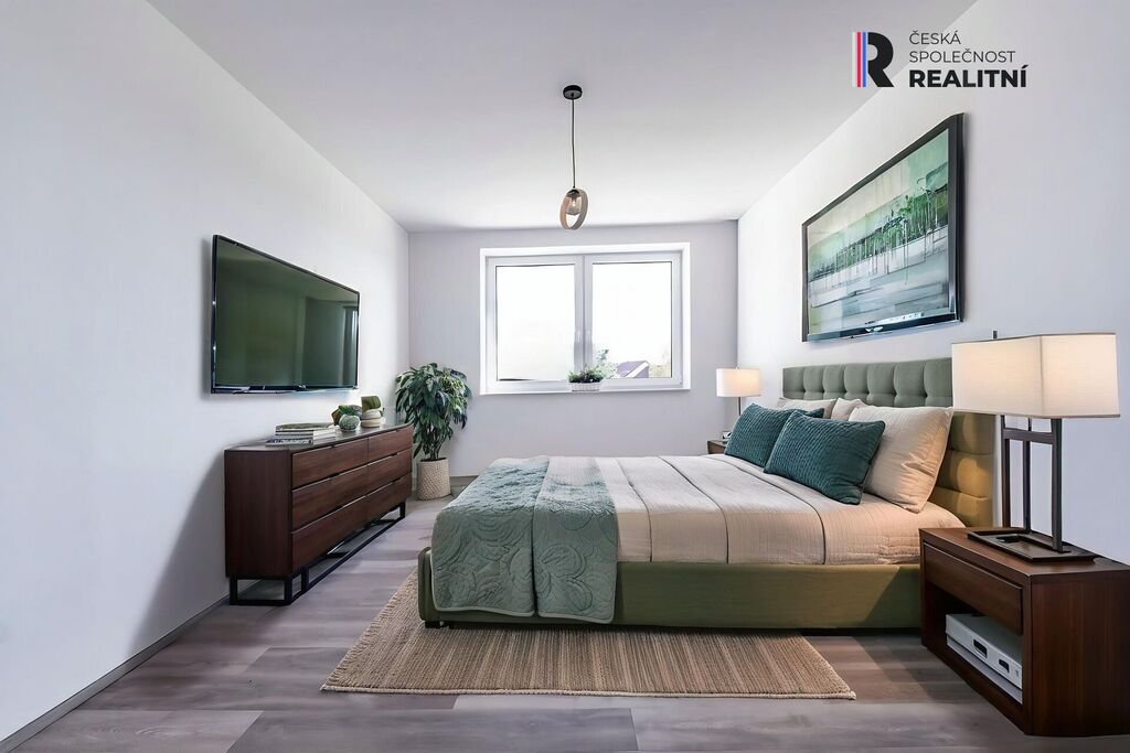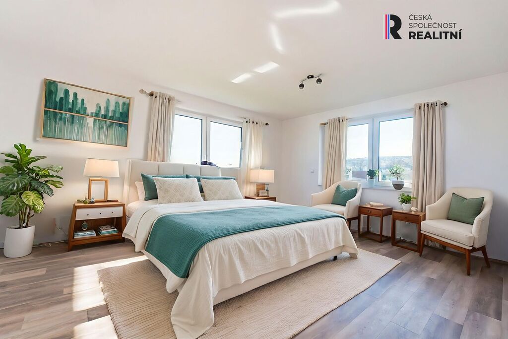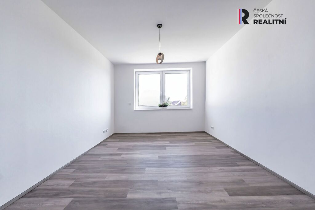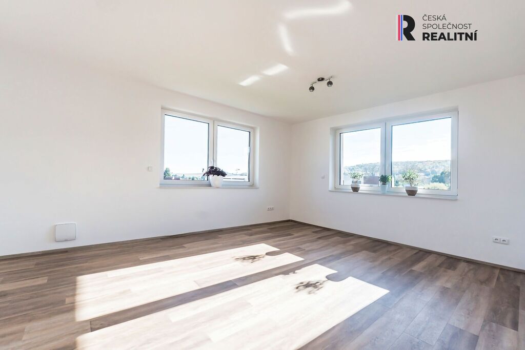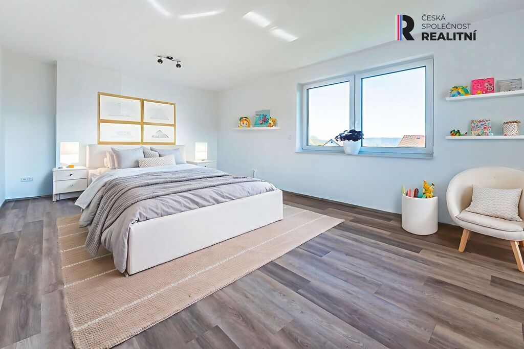 Prostorný pokoj (24,9 m²) nabízí široké možnosti využití – kromě jiného jej lze eventuelně rozdělit na dva samostatné pokoje, případně z něj vytvořit další obývací prostor pro dvougenerační bydlení.