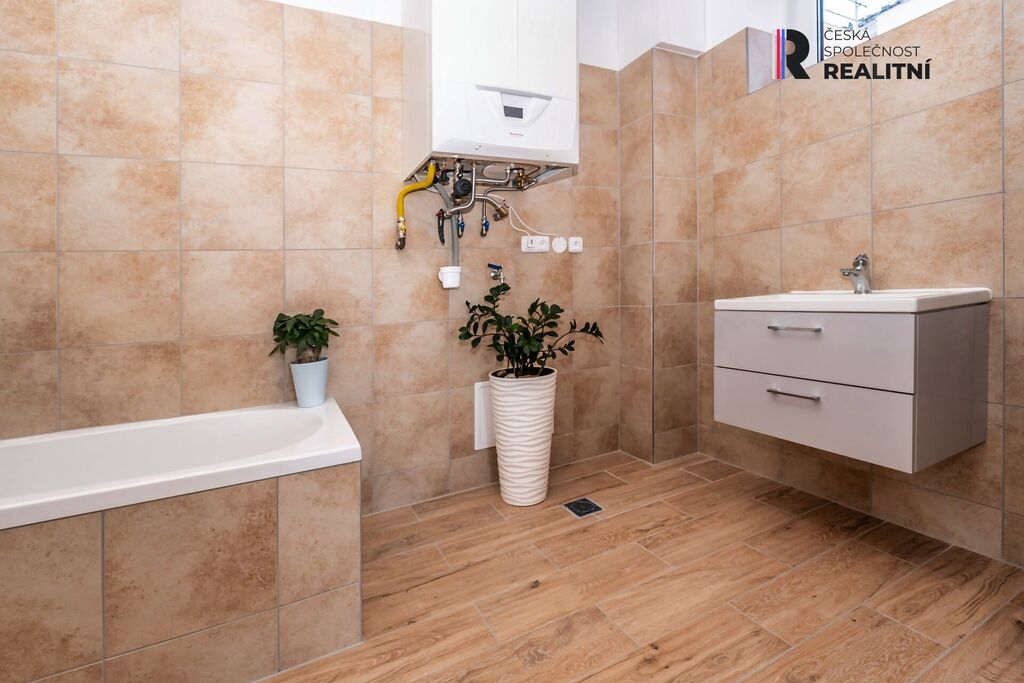 Vytápění zajišťuje plynový kombinovaný kotel napojený na teplovodní podlahové topení, které zaručuje příjemný a rovnoměrný tepelný komfort v celém domě.