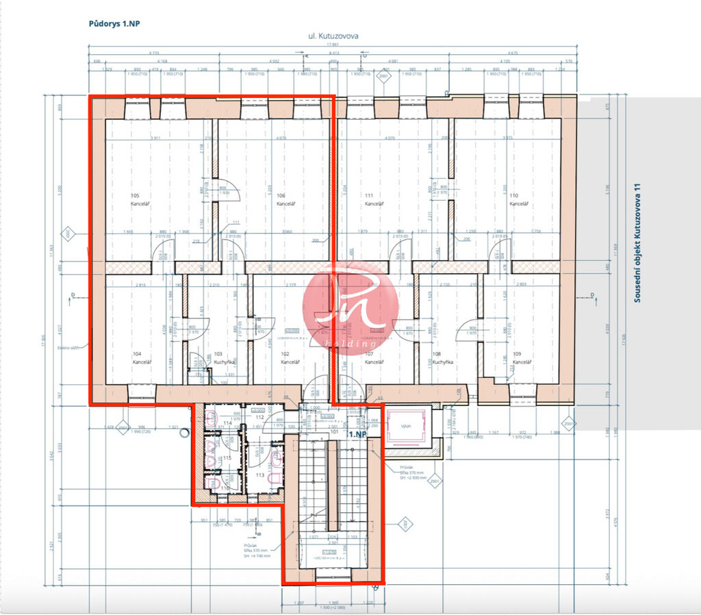 4 prostorné kanceláře, kuchyňka, WC na chodbě - celkově 78,05 m²