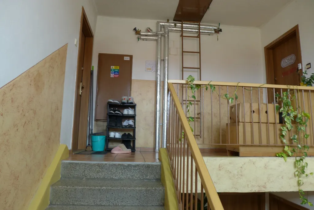 Dispoziční řešení: chodba se vstupem na samostatné WC a vstupem do koupelny se sprchovým koutem, umyvadlem a el. bojlerem na ohřev vody.
