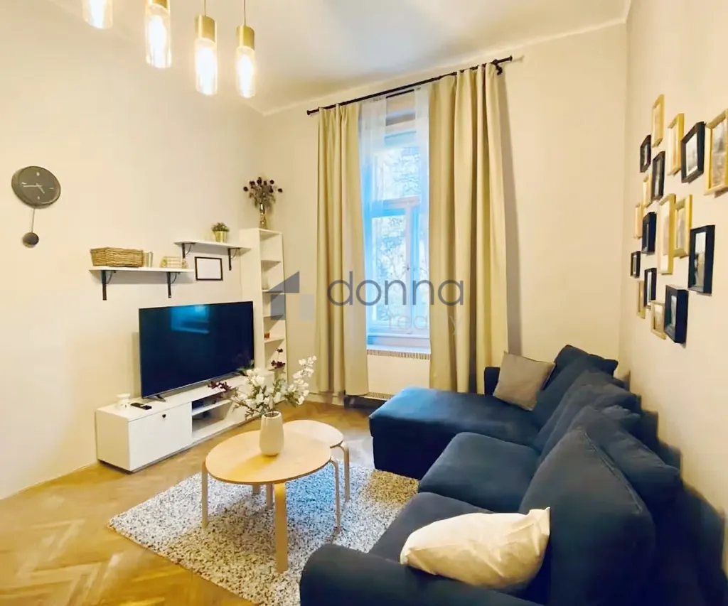 Byt je vybavený kuchyňskou linkou se spotřebiči (trouba, plynová varná deska, myčka, velká lednice, mikrovlnná trouba), obývací pokoj s pohovkou a TV koutem, ložnice s manželskou postelí a úložným prostorem. Koupelna se sprchovým koutem, pračkou a toaletou. Topení etážové plynové - nový kondenzační kotel. Vysoké stropy, parketové podlahy. K dispozici sklep (4m²) a zahrada za domem (cca 50m²). Klidná ulice u náměstí Jiřího z Poděbrad a stanice metra, v okolí kavárny, restaurace, trhy a parky.