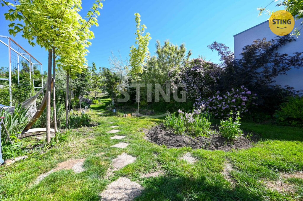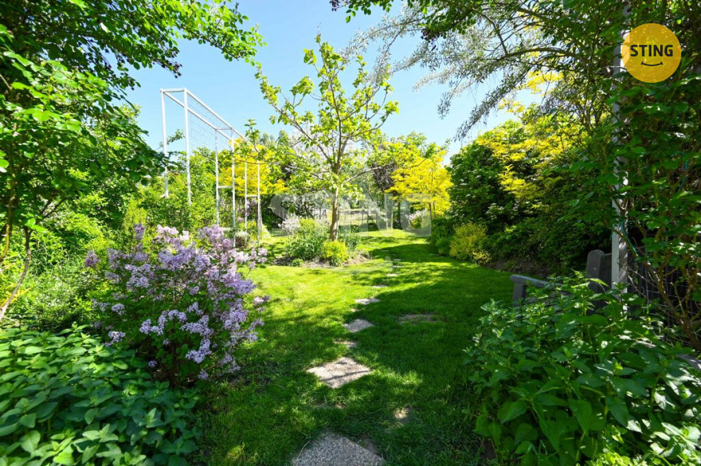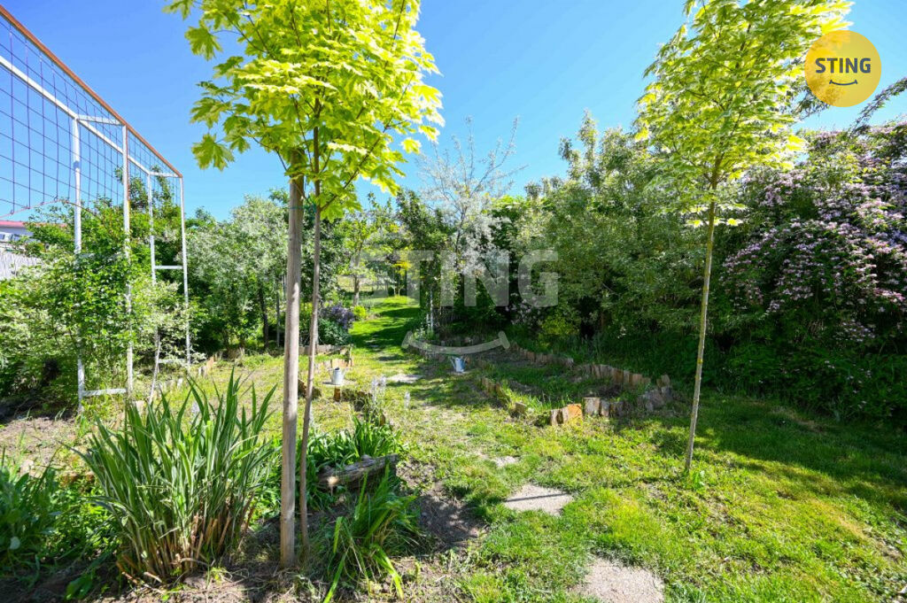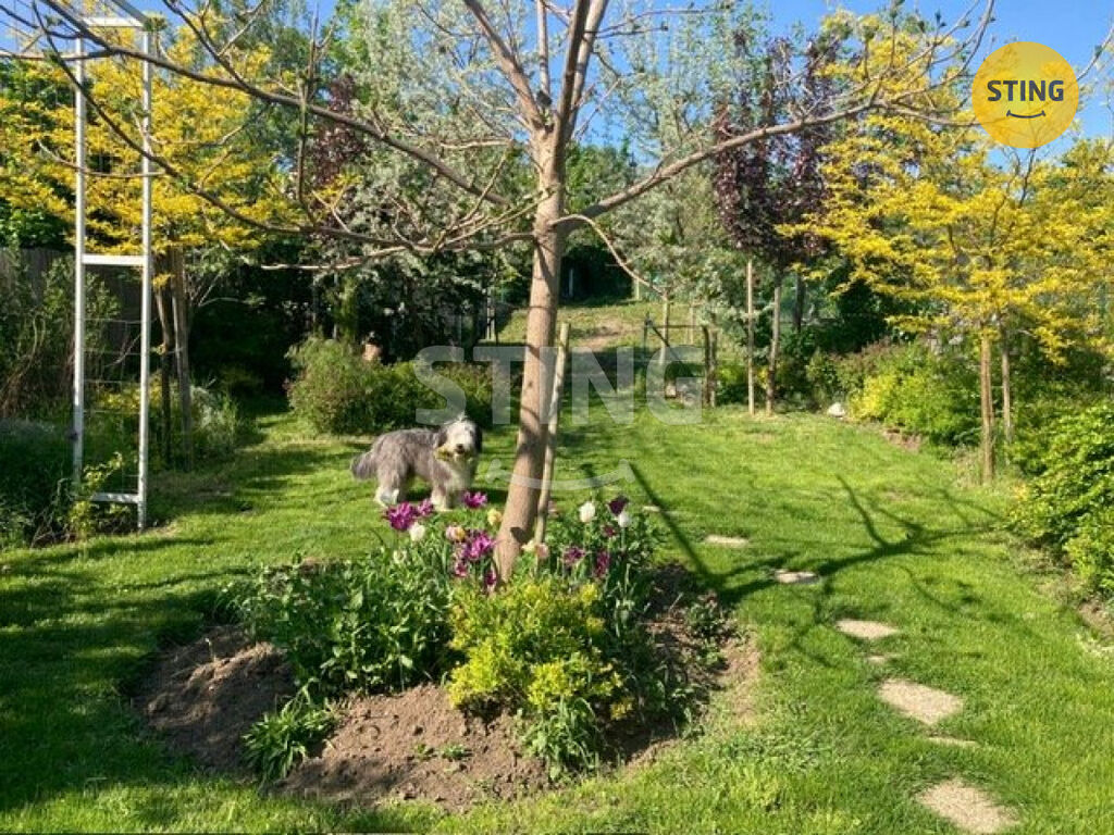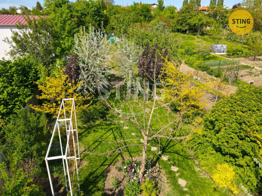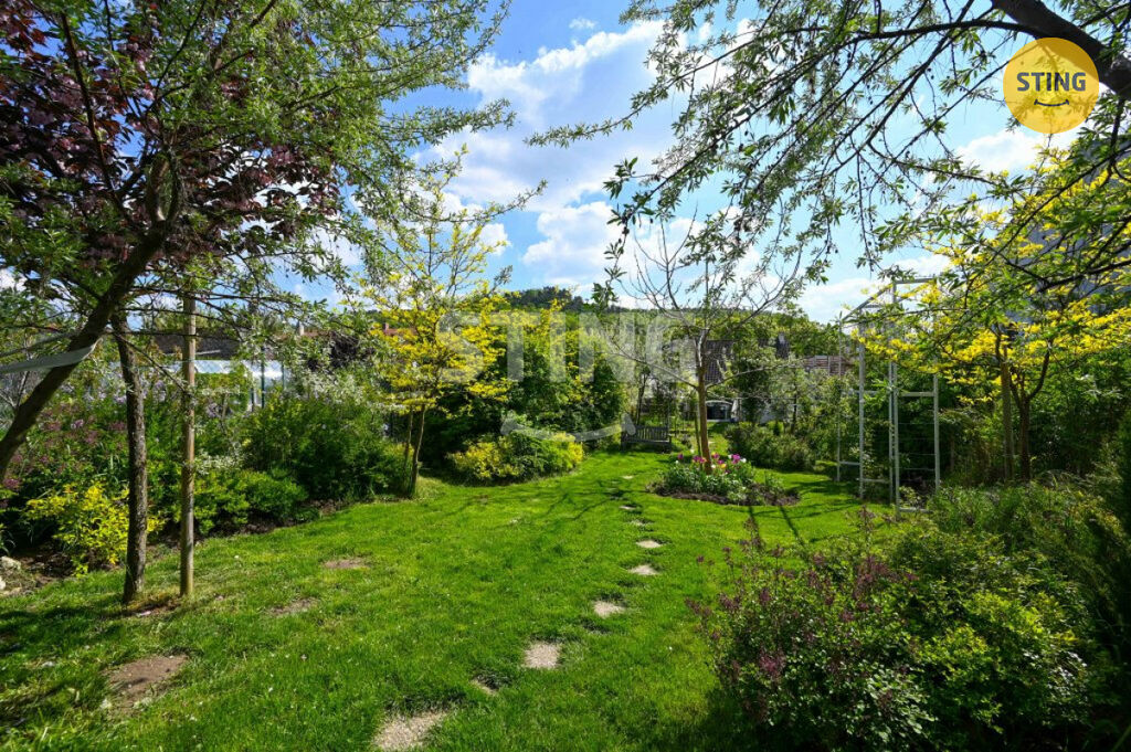 Pozemek o rozloze 740 m² je rozdělen na užitkovou a odpočinkovou zónu. Na spodní terase máte dostatek úložného prostoru na zahradní náčiní, a zároveň zde můžete dobudovat bazén či jinou relaxační zónu. Po schodech se dostanete do horní části zahrady s dalším prostorem pro odpočinek.