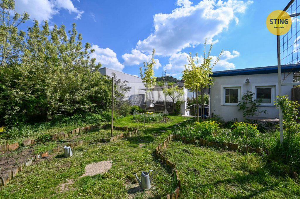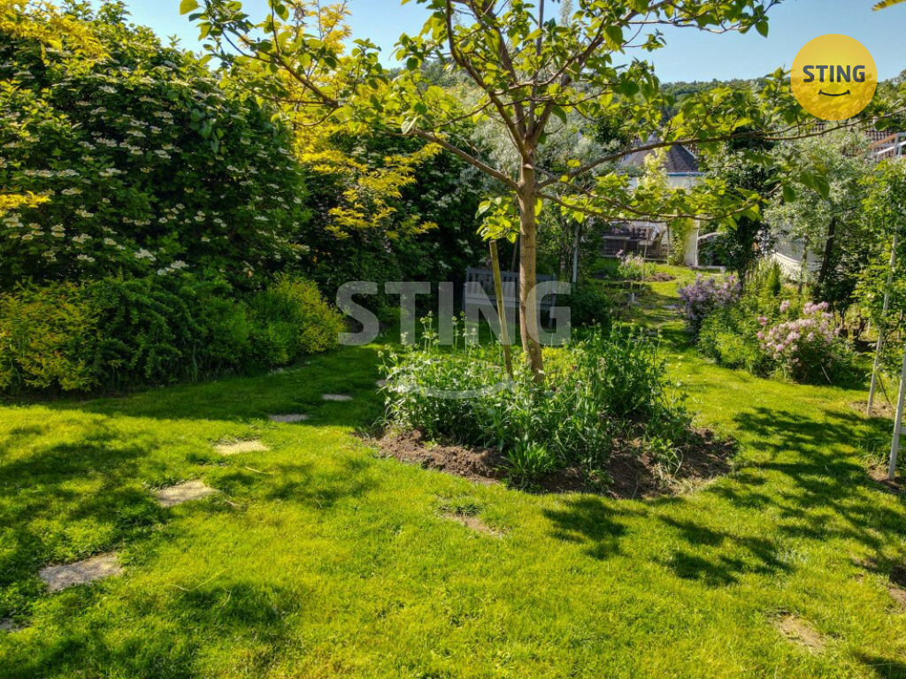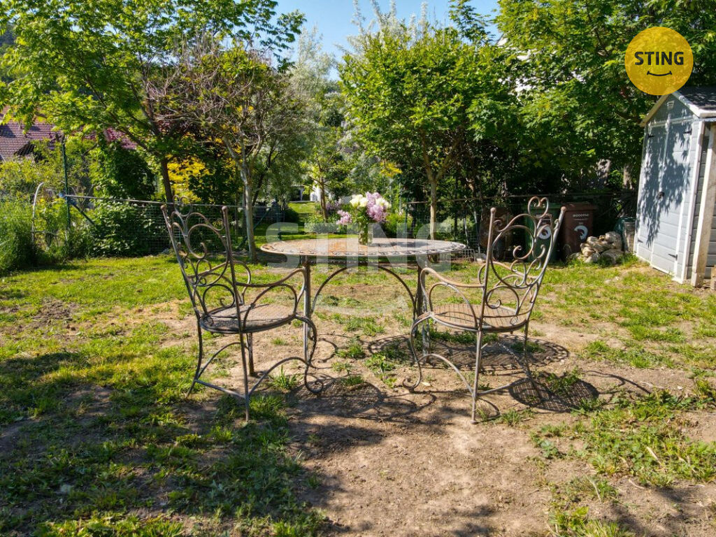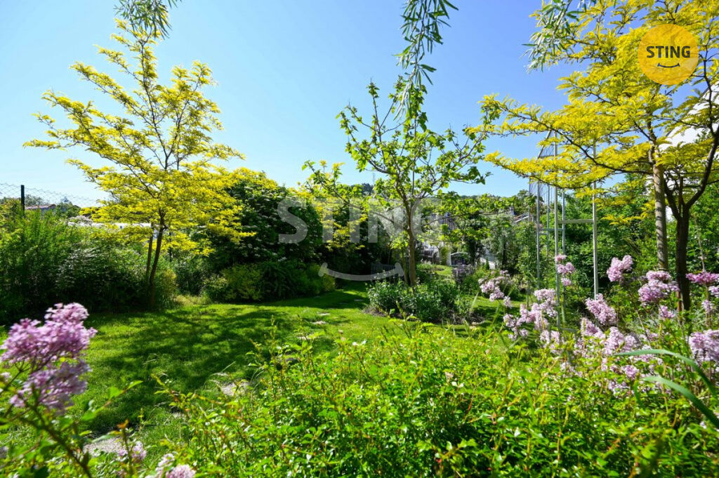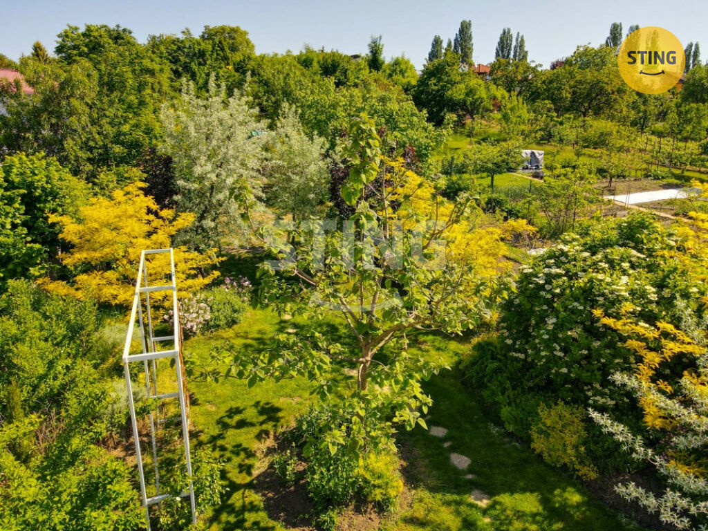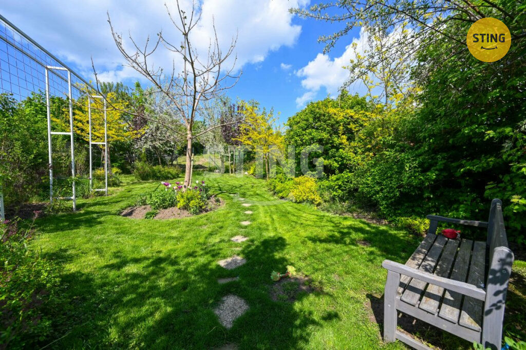 Pozemek o rozloze 740 m² je rozdělen na užitkovou a odpočinkovou zónu. Na spodní terase máte dostatek úložného prostoru na zahradní náčiní, a zároveň zde můžete dobudovat bazén či jinou relaxační zónu. Po schodech se dostanete do horní části zahrady s dalším prostorem pro odpočinek.