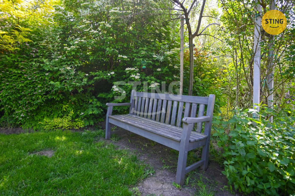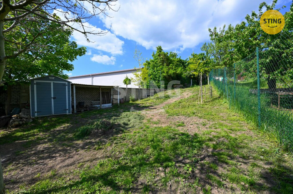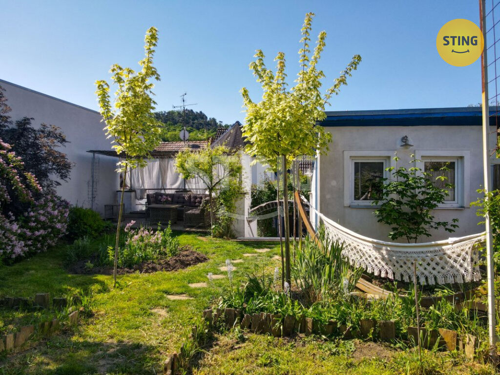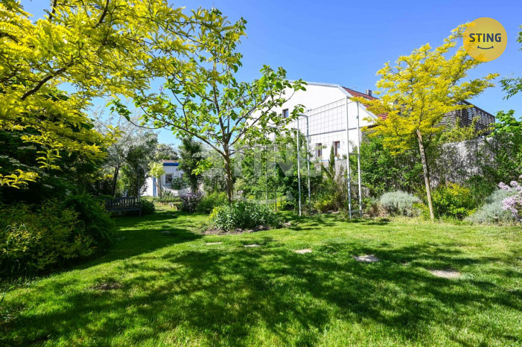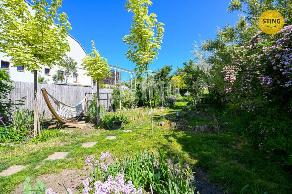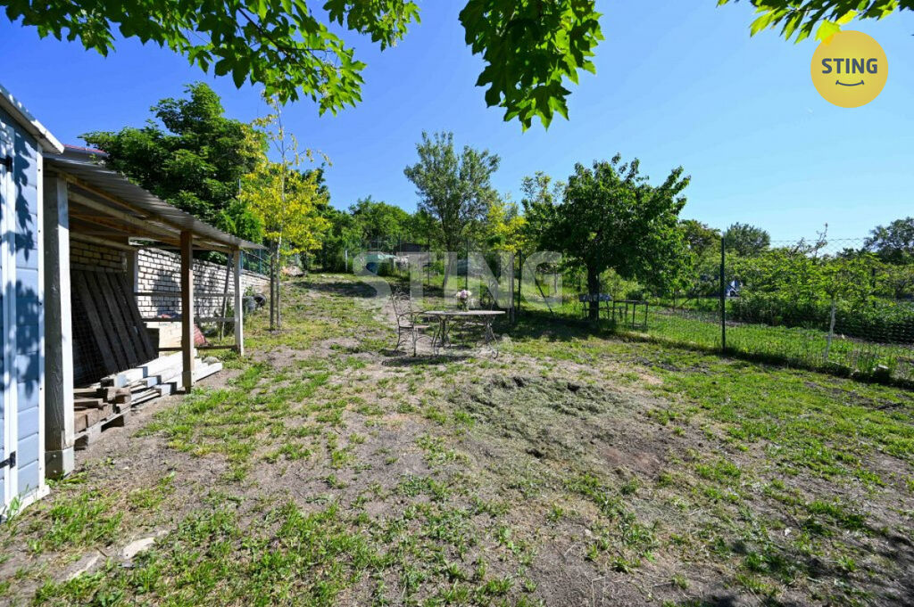 Pozemek o rozloze 740 m² je rozdělen na užitkovou a odpočinkovou zónu. Na spodní terase máte dostatek úložného prostoru na zahradní náčiní, a zároveň zde můžete dobudovat bazén či jinou relaxační zónu. Po schodech se dostanete do horní části zahrady s dalším prostorem pro odpočinek.