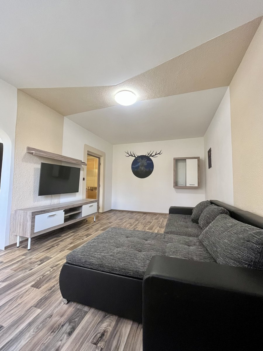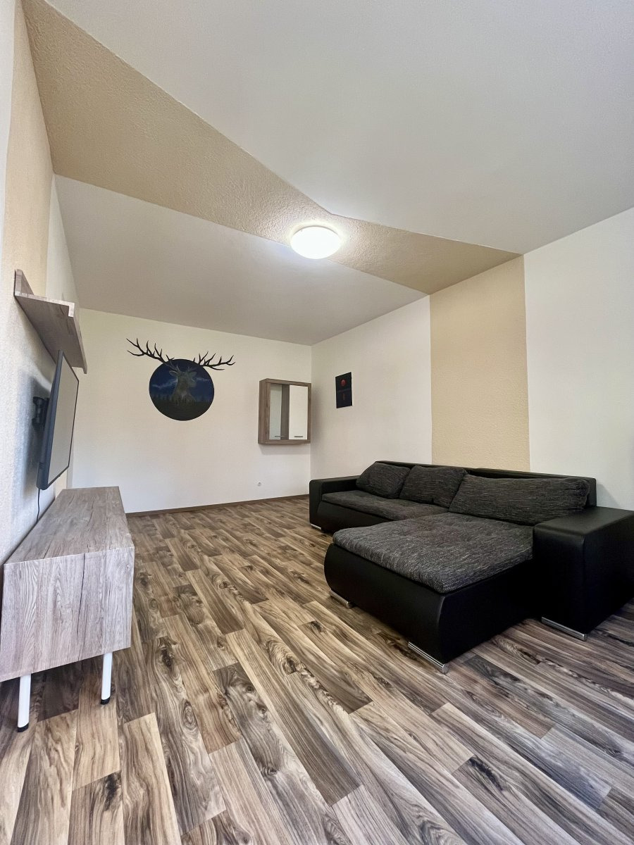 Obývací pokoj s gaučem, TV stolkem a televizí
