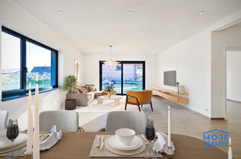 Dominantou domu je světlý obývací pokoj propojený s kuchyní a jídelní částí, odkud je přímý vstup na zahradu. Ze všech obytných místností – ložnice i dvou dětských pokojů – lze vyjít přímo ven, což dodává domu vzdušnost a propojuje interiér s exteriérem. Dále se v domě nachází vstupní chodba, která je prostorná a prakticky řešená, koupelna s vanou, sprchovým koutem a samostatná toaleta. K dispozici je také technická místnost s místem pro pračku a sušičku.