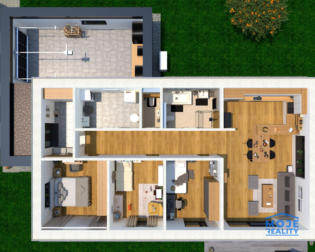 Nabízíme k prodeji novostavbu komfortního rodinného domu o dispozici 4+kk s garáží a prostornou zahradou o výměře 1080 m².