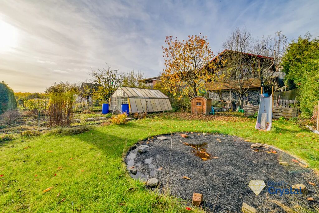 Na zahradě se nachází dětský zahradní domeček a skleněný skleník.