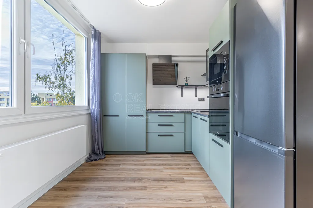 Byt je vybaven kuchyňskou linku z části s vestavěnými spotřebiči, což zajišťuje pohodlí a přitom dává prostor k vlastnímu stylu a úpravám.