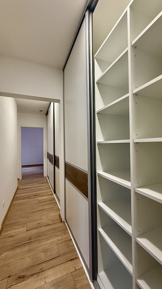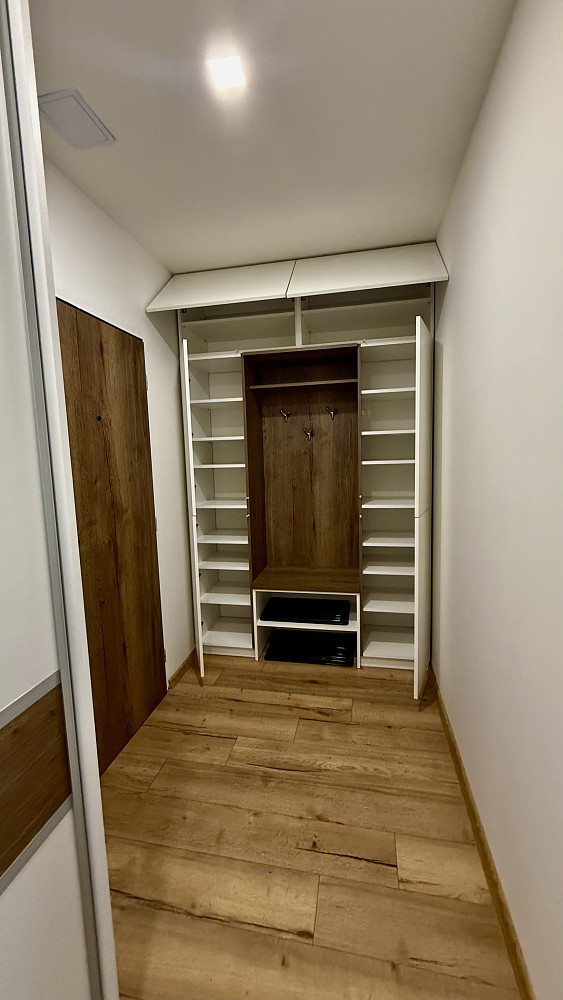 V předsíni nutno vyzdvihnout skříně na míru i předsínovou stěnu.