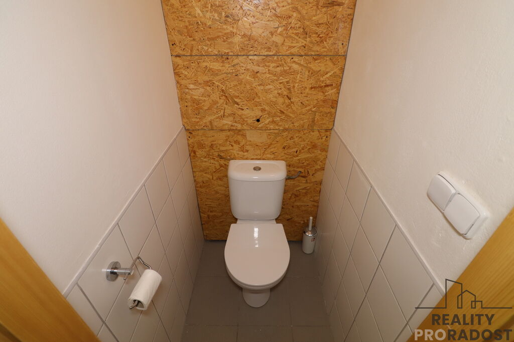 Bytové jádro je zděné. Najdeme zde koupelnu vybavenou zděným sprchovým koutem a přípojkou na pračku, a samostatnou toaletu.