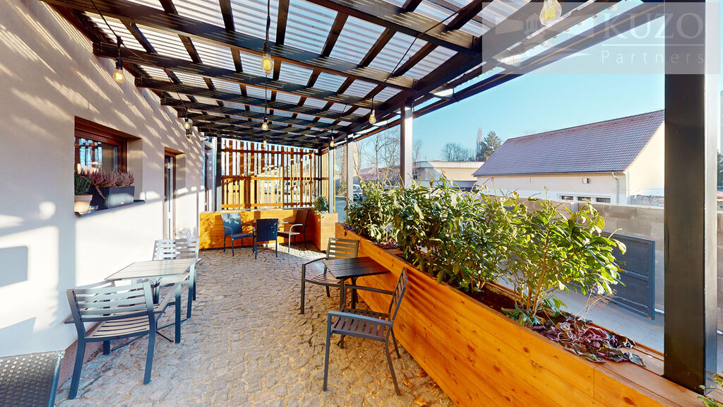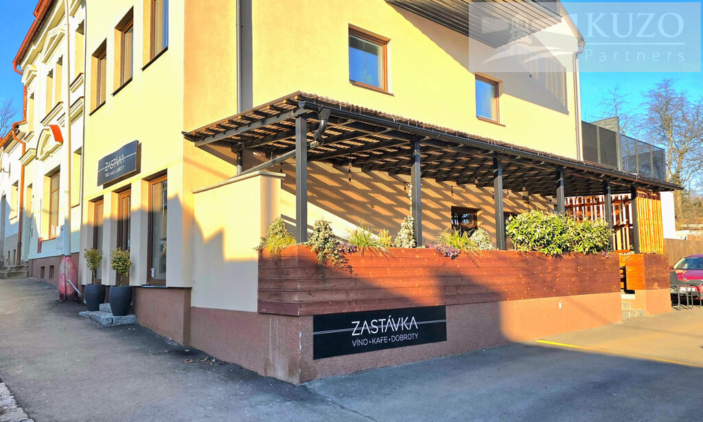 PRODÁVÁ SE KOMPLET: Nemovitost, VLASTNÍ TERASA (bez nájmu městu) a VLASTNÍ PARKOVIŠTĚ pro zákazníky (4 vozy) + 2 místa pronajatá od města.