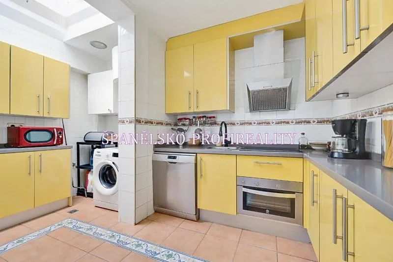 Kuchyňský kout: Plně vybavená kuchyňská linka se sporákem, varnou deskou, myčkou, mikrovlnnou troubou a pračkou.