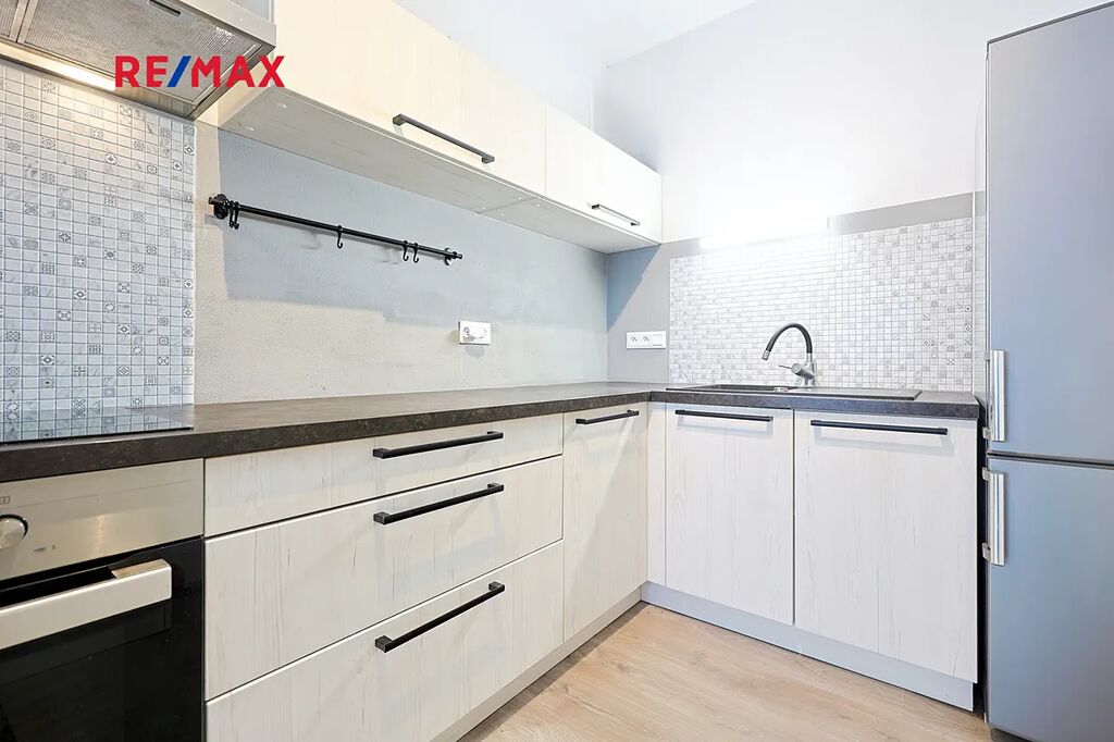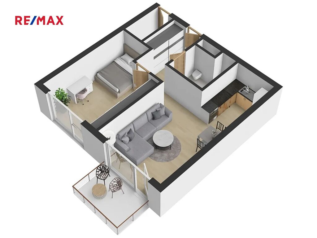 Byt je dispozičně řešen jako prostorný obývací pokoj s kuchyňským koutem, který je vybaven moderní kuchyňskou linkou včetně vestavěných spotřebičů – lednice, elektrická trouba, sklokeramická varná deska a komínová digestoř. V obývací části se nachází jídelní stůl se židlemi a pohodlná sedací souprava. Koupelna je vybavena sprchovým koutem, umyvadlem, toaletou a pračkou. V ložnici je k dispozici postel a šatní skříň.