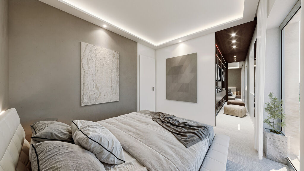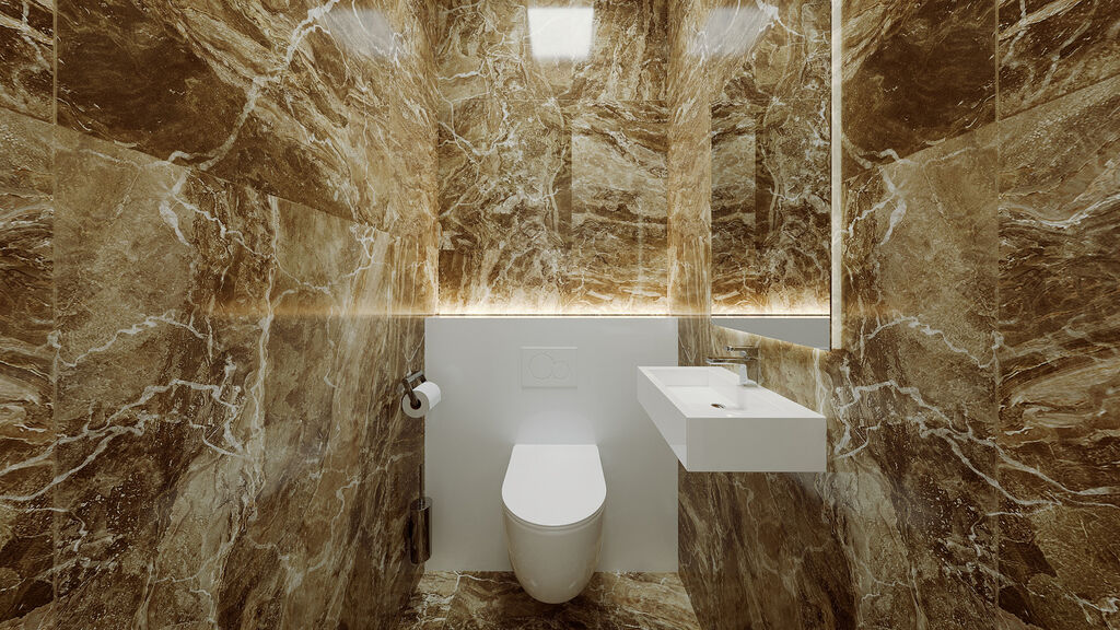 • Luxusně zařízená koupelna dle vizualizací (vana, sprchový kout, podomítkové baterie, dvojité umyvadlo, osvětlené zrcadlo, topný žebřík, nika)