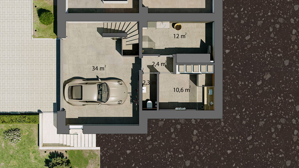 • Velkorysá garáž pro 2 vozy (35 m²) obložená italským travertinem