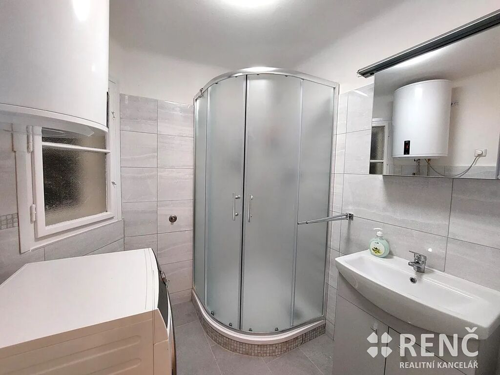 Koupelna je společná s WC,  je vybavena umyvadlem, sprchovým koutem, koupelnovým nábytkem (skříňka pod umyvadlem, zrcadlová skříňka) a pračkou. Je zde umístěn bojler na ohřev vody.