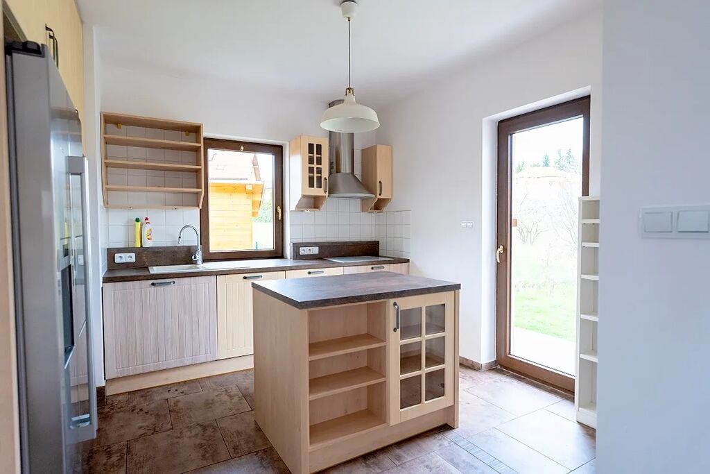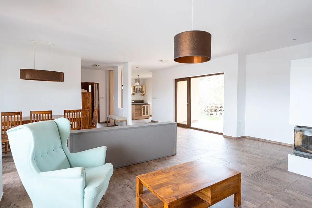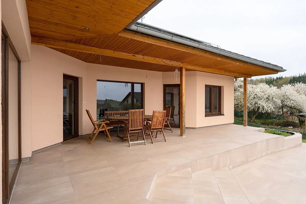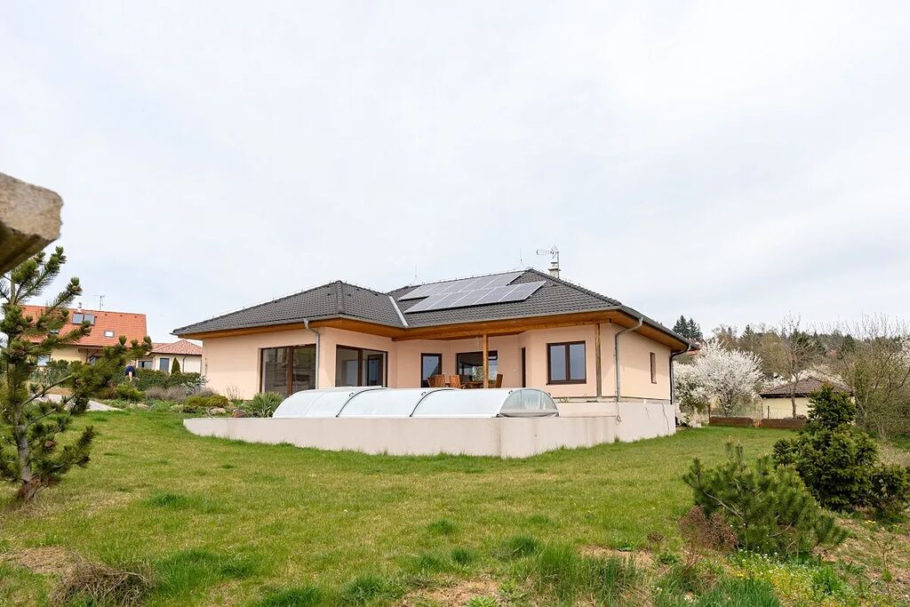 Atraktivní nabídka prodeje velmi hezkého a útulného přízemního atriového rodinného domu s venkovním bazénem a fotovoltaickými panely na střeše domu, obec Ondřejov, okres Praha-východ. Součástí zděného a částečně podsklepeného rodinného domu s užitnou plochou 151 m2 je prostorný obývací pokoj s kuchyní a jídelnou (60 m2) a výstupem na dvě terasy (západní k venkovnímu bazénu a východní pro poklidné ranní snídaně), tři ložnice, kde každá má výstup na terasu (16,11 a 11m2), koupelna s vanou, sprchou a umyvadlem (10 m2), samostatná toaleta, prádelna s dalším WC a umyvadlem, velká pracovna, která lze předělat na ložnici (25 m2) s výstupem na hlavní terasu, spíž (1,5 m2) a vstupní zádveří (4 m2). Součástí domu je také sklep o ploše 58 m2. Vytápění domu je elektrické vodovodní podlahové s možností ohřevu přes výměník v krbu, který je umístěný v obývacím pokoji. Celková rozloha slunného pozemku činí 1 103 m2, zastavěná plocha je 180 m2. Na střeše domu je deset fotovoltaických panelů na výrobu elektřiny s nástěnným boxem na dobíjení elektromobilů. Parkování je na zpevněné ploše před vstupem do domu pro minimálně 3 osobní vozy. Dům má vlastní studnu a kanalizace je svedena do vlastní čističky se zásobníkem na vodu. Napojení na sítě je možné na konci ulice. Krytý venkovní bazén s protiproudem a slanou vodou má rozměr 6 x 3 m, hloubku 1,5 m. Příjemným prvkem jsou 3 terasy u domu o celkové ploše 70 m2. PENB B. Zahrada je jen částečně založena a umožňuje tak novým majitelům dotvořit si ji dle svých představ. U vstupu na pozemek je skalka v provence stylu, dále je na zahradě jabloň, dvě třešně, maliny, angrešt, lískový ořech. Dům leží v klidné rezidenční části Ondřejova v blízkosti luk a vstupu do přilehlého lesa. Obec Ondřejov rozkládající se na jižních svazích hory Pecný se nachází 15 kilometrů od města Říčany, 35 km od Prahy a 6 km od Senohrab. Ondřejov je dobře dostupný i PID (např. přímou autobusovou linkou k metru trasy C Háje nebo do Stránčic a poté vlakem směr Praha hl. n.). V obci, jejíž historické centrum je městskou památkovou zónou, je nová moderní základní škola, dvě mateřské školy (státní i soukromá), cukrárna, kavárna, lékárna, dva obchody s potravinami, hospoda a oblíbená restaurace s pizzerií. Dále je zde skvěle fungující sportovně kulturní centrum s rozmanitou nabídkou aktivit, kroužků a lekcí pro děti i dospělé. Nad Ondřejovem je také známá hvězdárna – pracoviště Astronomického ústavu AV ČR. Vedení obce pravidelně organizuje různé společenské akce, na kterých se zdejší obyvatelé rádi schází a baví. Nákupem domu, který je k nastěhování ihned, nezískáváte jen nové bydlení, ale útulný domov s přátelskými sousedy. Cena k jednání.