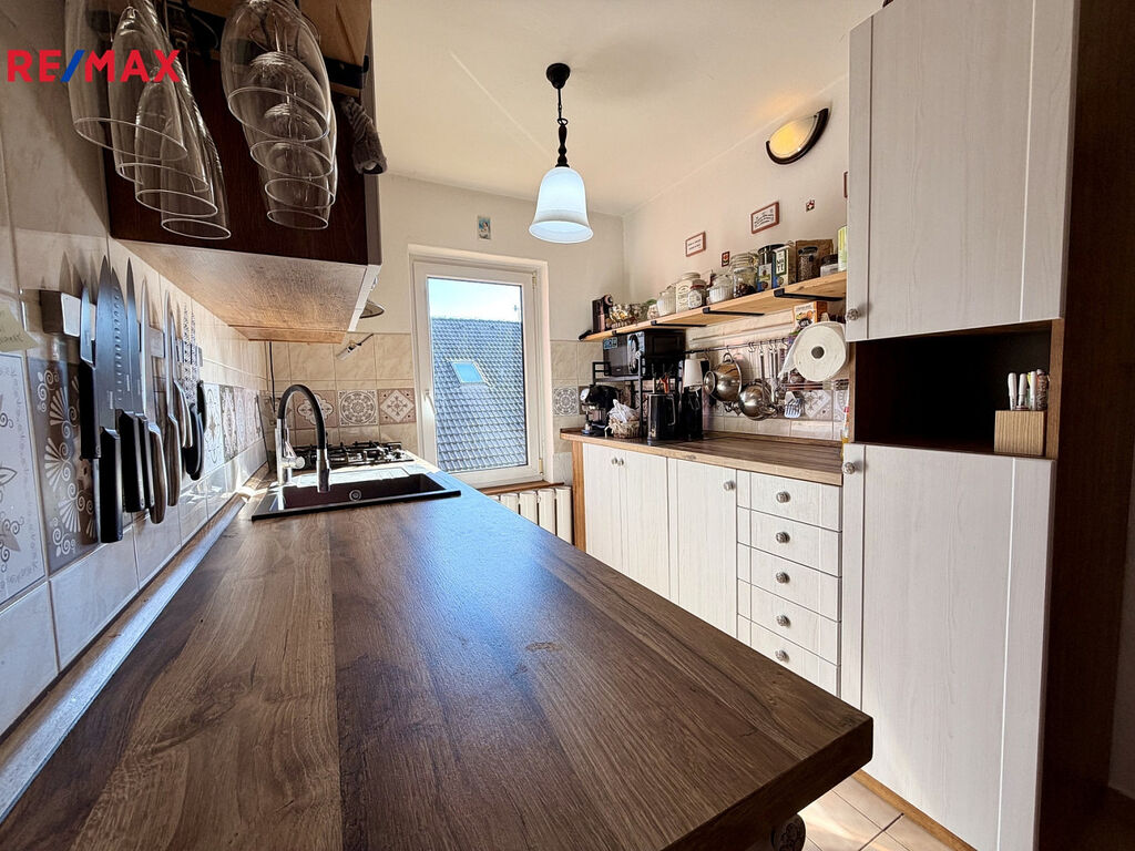 Byt o podlahové ploše 70 m² je situovaný v patře rodinného domu. Je ve velmi pěkném stavu, rekonstrukce proběhla před dvaceti lety. Je vybavený nábytkem dle fotografií (majitel si odveze akorát postel, komodu a knihovničku z ložnice a TV + křeslo z obýváku). K dispozici je i plně vybavená kuchyňská linka včetně myčky, lednice a pračky).