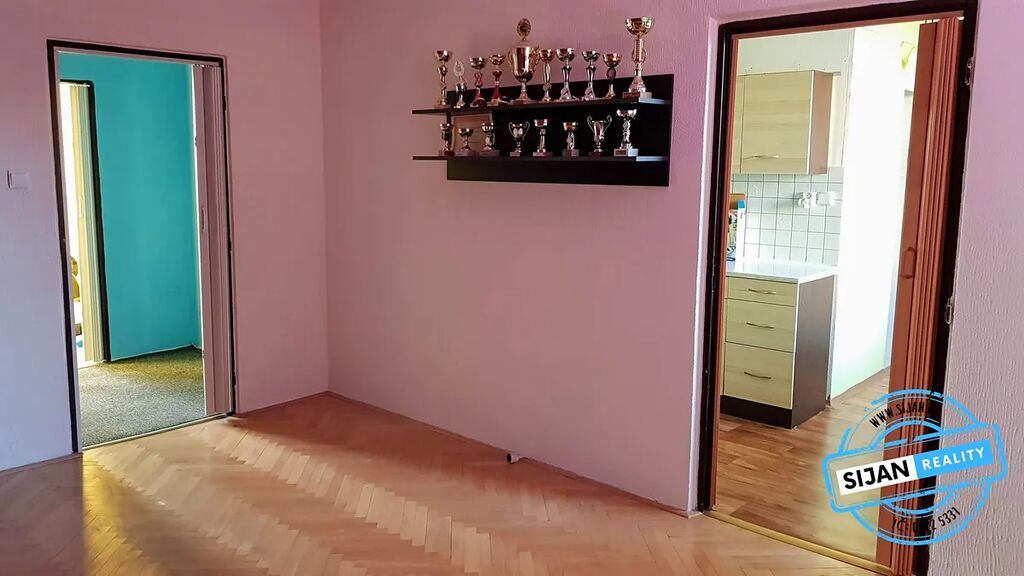 Dispozice bytu je velmi praktická – tvoří ji vstupní chodba, neprůchozí pokoje, prostorná kuchyně s jídelním koutem, koupelna s vanou, samostatné WC a úložná komora.