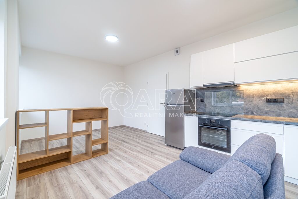 V bytě je k dispozici moderní kuchyňská linka vybavená indukční varnou deskou, digestoří, pečící troubou a myčkou nádobí, dále pak také chladničkou s mrazákem.