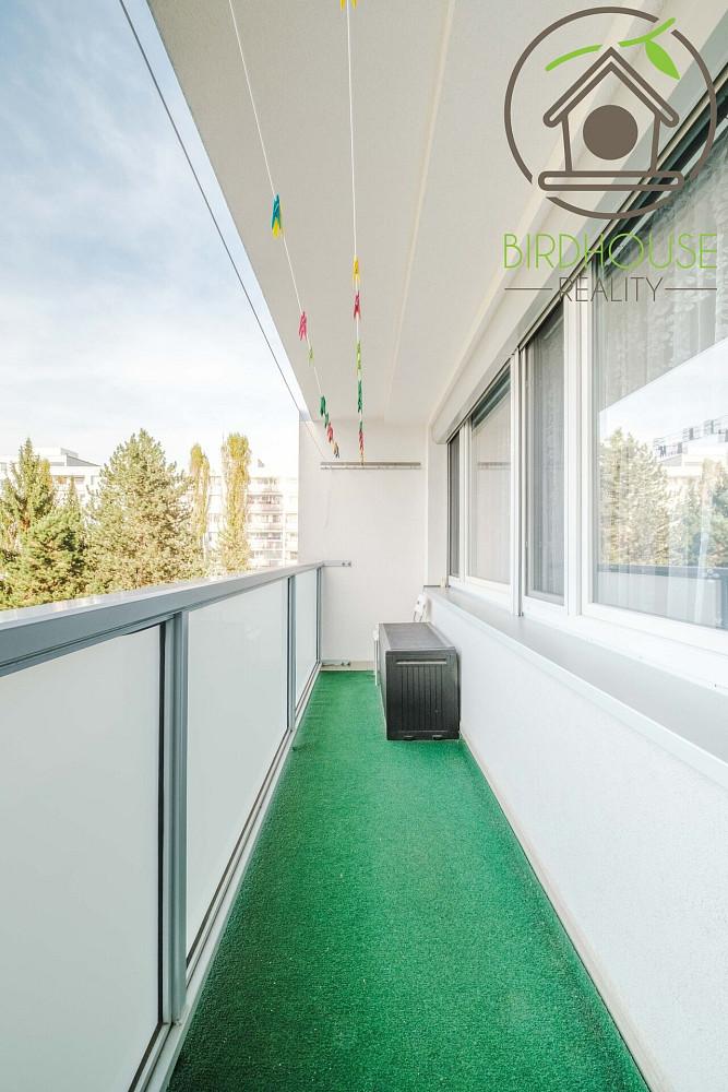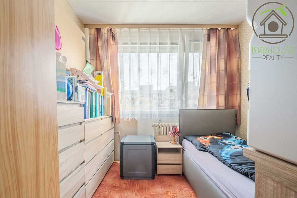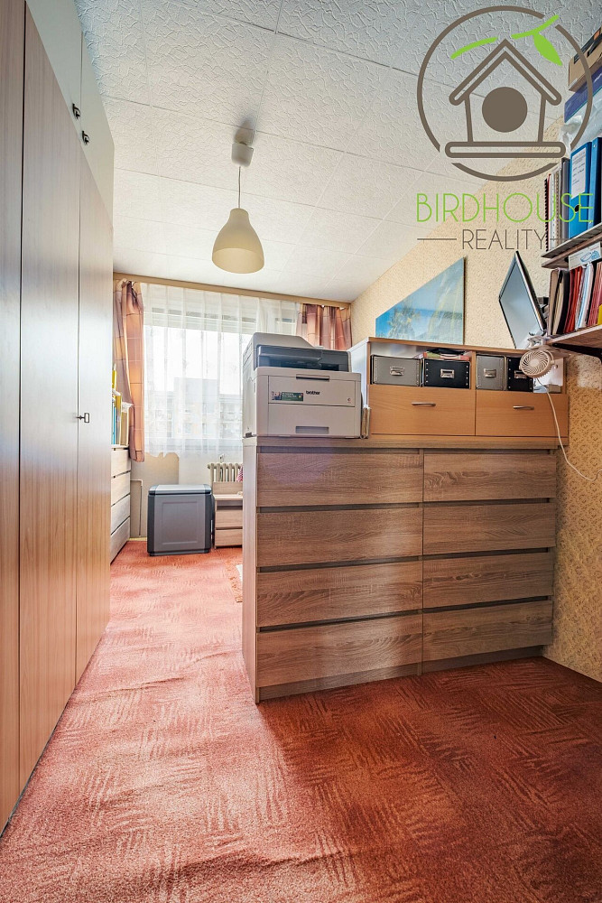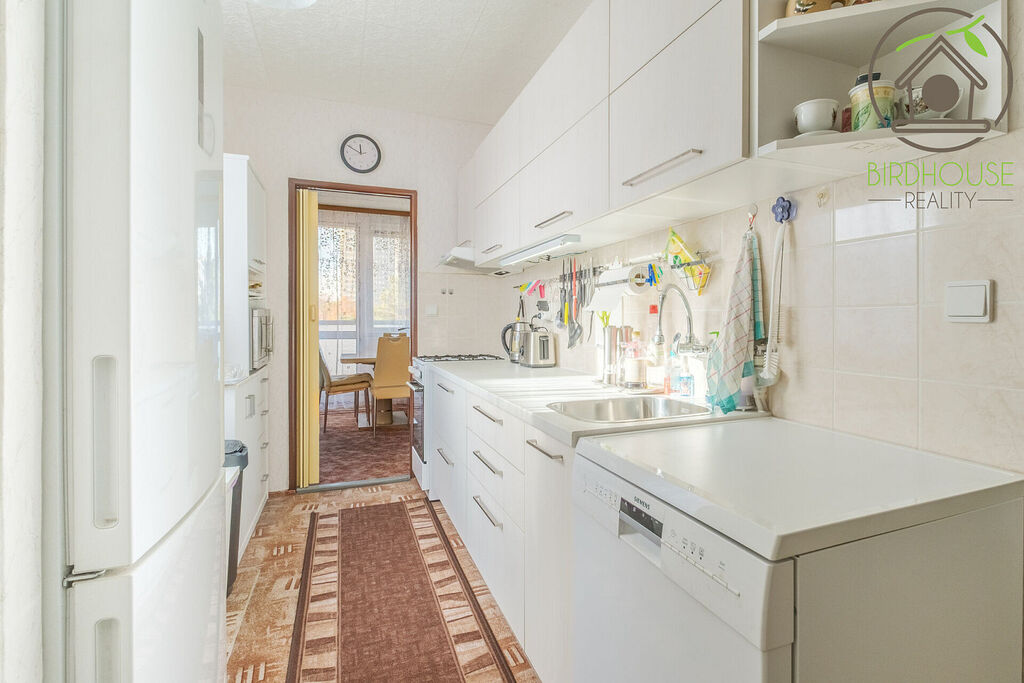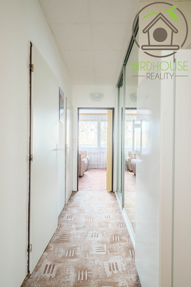 Obývací pokoj (21,1 m²) poskytuje dostatek prostoru pro sezení i jídelní kout a nabízí přímý vstup na prostornou lodžii (6,9 m²), která je ideální pro odpočinek. Kuchyně (8,54 m²) je vybavena kuchyňskou linkou ve velmi dobrém stavu. Dva samostatné pokoje (12,2 m² a 13,5 m²) lze využít jako ložnici a dětský pokoj, případně pracovnu. Všechny pokoje jsou vybavené praktickými předokenními roletami, které zajišťují soukromí.