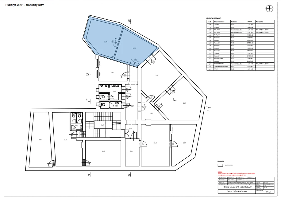 Kancelář je tvořena dvěma místnostmi (každá cca 21m2). Na patře je pak pánské i dámské WC a společná kuchyňka.