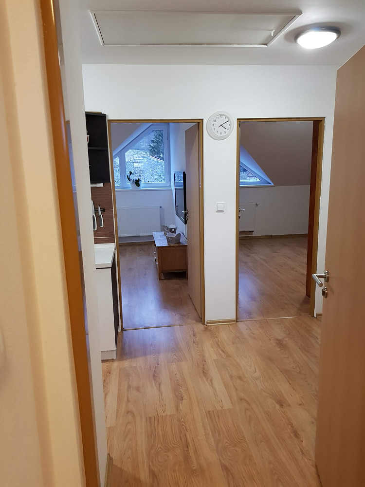K pronájmu nabízíme kompletně zařízený nový byt 3+1 v klidné lokalitě s výhledem na les. Byt o celkové výměře 94m² se nachází v 3.NP - podkroví cihlového domu se společným vchodem z přízemí.
