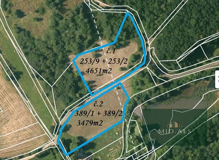 Nabízíme k prodeji dva pozemkové celky o výměrách 4 651 m2 a 3 479 m2 (celkem 8 130 m2).