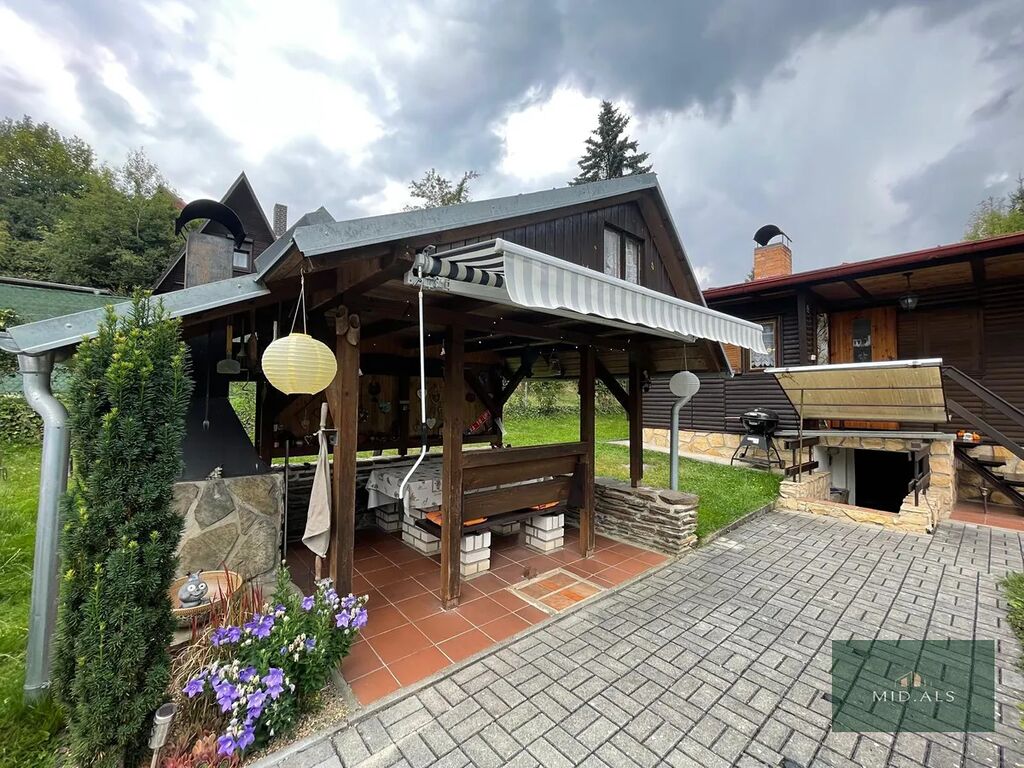 Na zahradě najdeme stylové zastřešené venkovní sezení s krbem, menší půda nad sezením může být využita jako alternativní možnost přespání, či jen jako úložný prostor.
