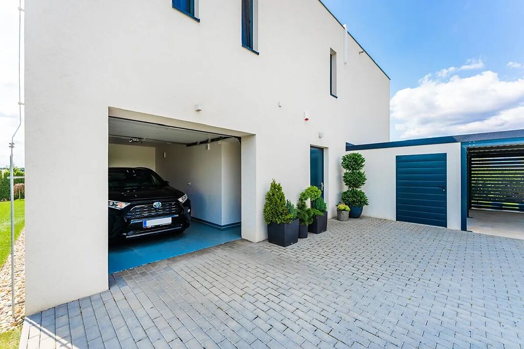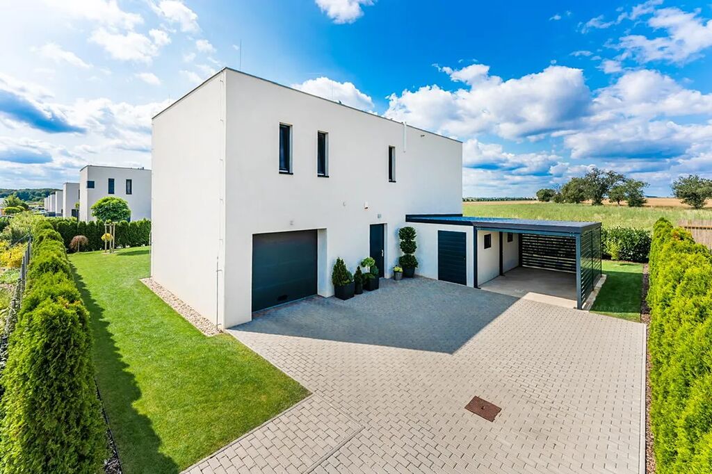 Před domem se nachází prostorná zahradní místnost vhodná na umístění kol, zahradního náčiní nebo venkovních hraček pro nejmenší a kryté venkovní stání pro druhý automobil.
