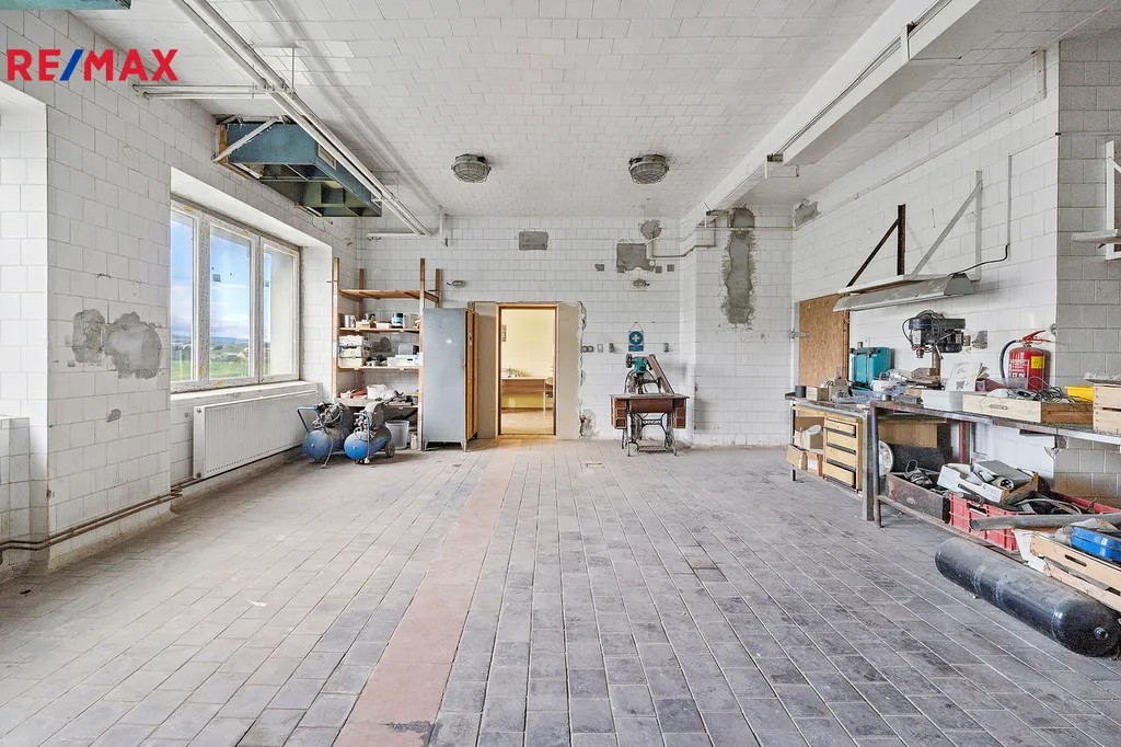 Dvoupodlažní budova s celkovou užitnou plochou 1 220 m², je aktuálně v 1. nadzemním podlaží dispozičně rozdělena na prostory výrobní, skladové a administrativní s odpovídajícím sociálním zázemím. Dominantním prostorem je 148 m² veliká dílna s výsuvnými vraty, která byla využívána pro servisování nákladních automobilů. K dispozici jsou rovněž 2 dvojgaráže.