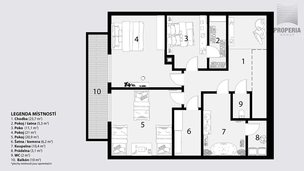 • tři neprůchozí pokoje – dva s balkonem a nádherným výhledem do okolní přírody, třetí s praktickým prostorem využitelným jako šatna