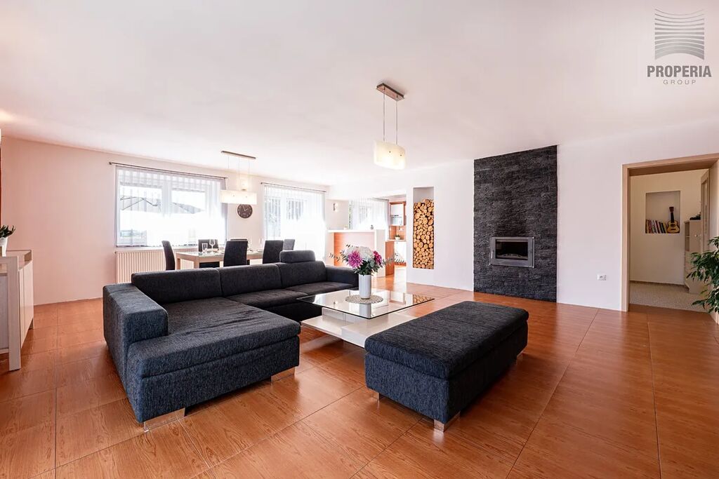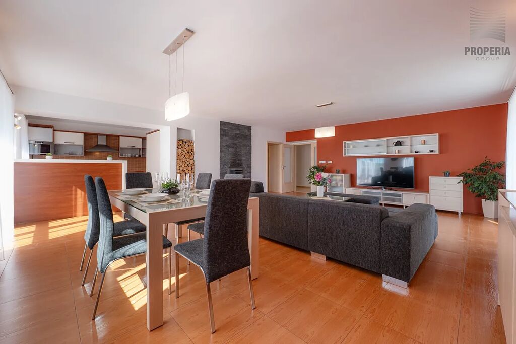 • obývací pokoj s krbem propojený s moderní kuchyní a jídelnou, odkud vedou dveře přímo na terasu