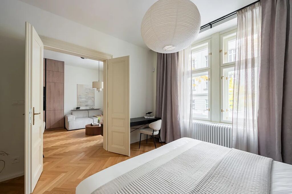 Luxusní zařízený, nově renovovaný byt 2+kk (1 ložnice, 1 koupelna), se šatnou, a sklepem, o celkové ploše 53,,m2, je situovaný v 1.NP (zvýšeném přízemí), v zrekonstruované rezidenční budově Moravianna, s výtahem, v oblíbené lokalitě Praha 2 Vinohrady, Moravská ulice.